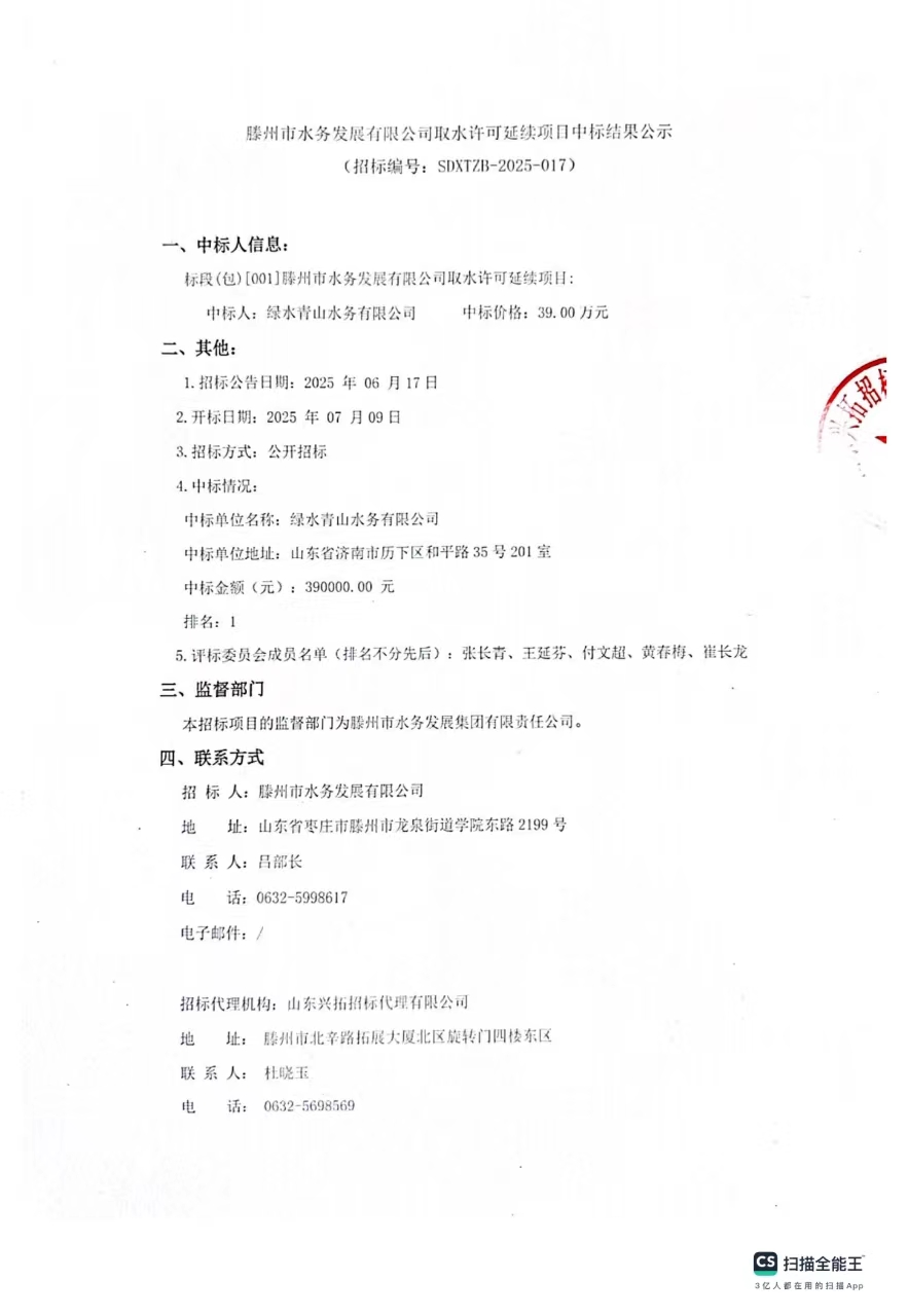 [【水发公司】滕州市水务发展有限公司取水许可延续项目 日期:2025-07-09 点击: 最新推荐 【中润公司】滕州市中润供水有限公司香舍里花园四期闸阀及双偏心法兰蝶阀、球墨铸铁管件、电磁水表采购项目三标段(二次)废标公告 2025-09-11 人气:5 【中润公司】滕州市城乡供水水质提升项目管线下穿枣木高速(S83)、321省道及东木路(10K+472、18K+614)涉路工程咨询服务采购项目谈判公告 2025-09-08 人气:7 【汇通公司】水泥钢边井盖、雨水箅采购项目(二次)竞争性磋商公告 2025-09-08 人气:4 【汇通公司】水泥钢边井盖、雨水箅采购项目流标公告 2025-09-08 人气:2 【水发公司】滕州市水务发展有限公司安全技术咨询服务项目竞争性磋商公告 2025-09-08 人气:10 【国润公司】滕州市南四湖湖水东调工程--采购标招标公告 2025-09-08 人气:5 【国润公司】滕州市南四湖湖水东调工程--监理标,检测标,施工标,其他标招标公告 2025-09-08 人气:5 【中润公司】滕州市城乡供水一体化安全巩固提升工程(一期)监理标、质量检测标、设计施工总承包(EPC)招标公告 2025-09-05 人气:11 【中润公司】滕州市中润供水有限公司第一净水厂厂区标准化提升改造物料制作安装工程采购项目询价公告 2025-09-05 人气:5 【中润公司】滕州市中润供水有限公司西办公楼配电改造工程采购项目询价公告 2025-09-05 人气:3