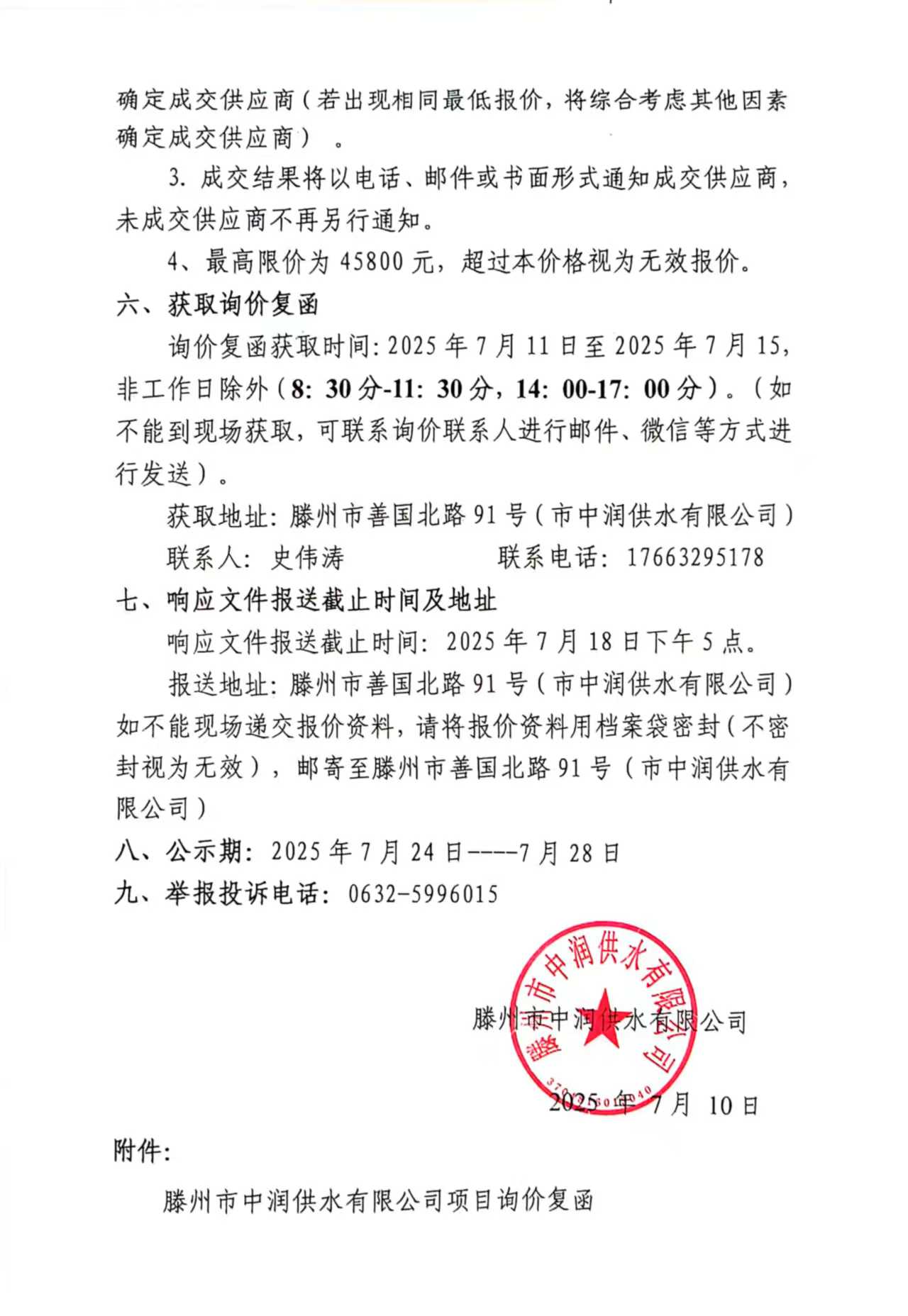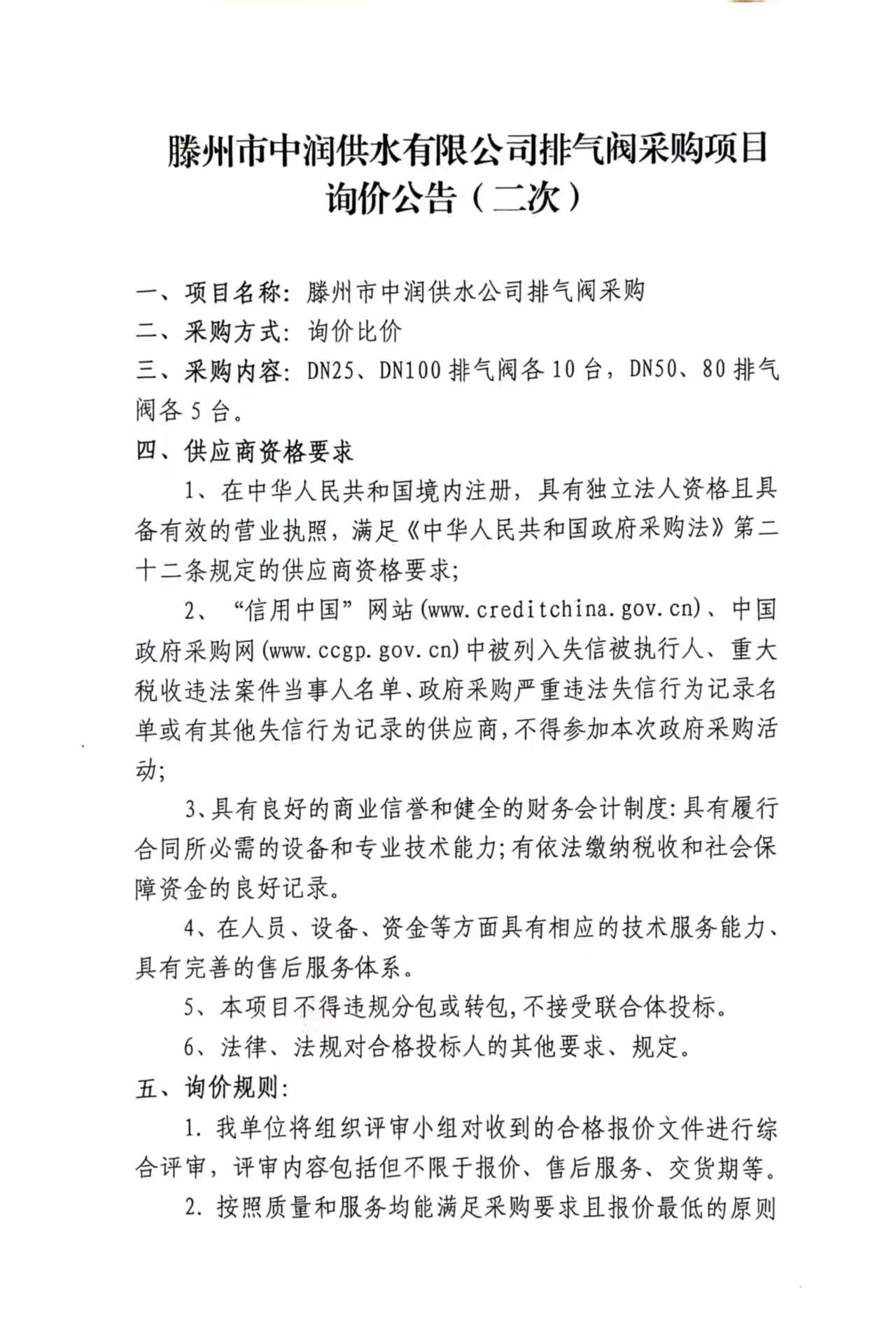 【中润公司】滕州市中润供水公司排气阀采购(二次) 日期:2025-07-10 点击: 最新推荐 【中润公司】滕州市中润供水有限公司香舍里花园四期闸阀及双偏心法兰蝶阀、球墨铸铁管件、电磁水表采购项目三标段(二次)废标公告 2025-09-11 人气:5 【中润公司】滕州市城乡供水水质提升项目管线下穿枣木高速(S83)、321省道及东木路(10K+472、18K+614)涉路工程咨询服务采购项目谈判公告 2025-09-08 人气:7 【汇通公司】水泥钢边井盖、雨水箅采购项目(二次)竞争性磋商公告 2025-09-08 人气:4 【汇通公司】水泥钢边井盖、雨水箅采购项目流标公告 2025-09-08 人气:2 【水发公司】滕州市水务发展有限公司安全技术咨询服务项目竞争性磋商公告 2025-09-08 人气:10 【国润公司】滕州市南四湖湖水东调工程--采购标招标公告 2025-09-08 人气:5 【国润公司】滕州市南四湖湖水东调工程--监理标,检测标,施工标,其他标招标公告 2025-09-08 人气:5 【中润公司】滕州市城乡供水一体化安全巩固提升工程(一期)监理标、质量检测标、设计施工总承包(EPC)招标公告 2025-09-05 人气:11 【中润公司】滕州市中润供水有限公司第一净水厂厂区标准化提升改造物料制作安装工程采购项目询价公告 2025-09-05 人气:5 【中润公司】滕州市中润供水有限公司西办公楼配电改造工程采购项目询价公告 2025-09-05 人气:3