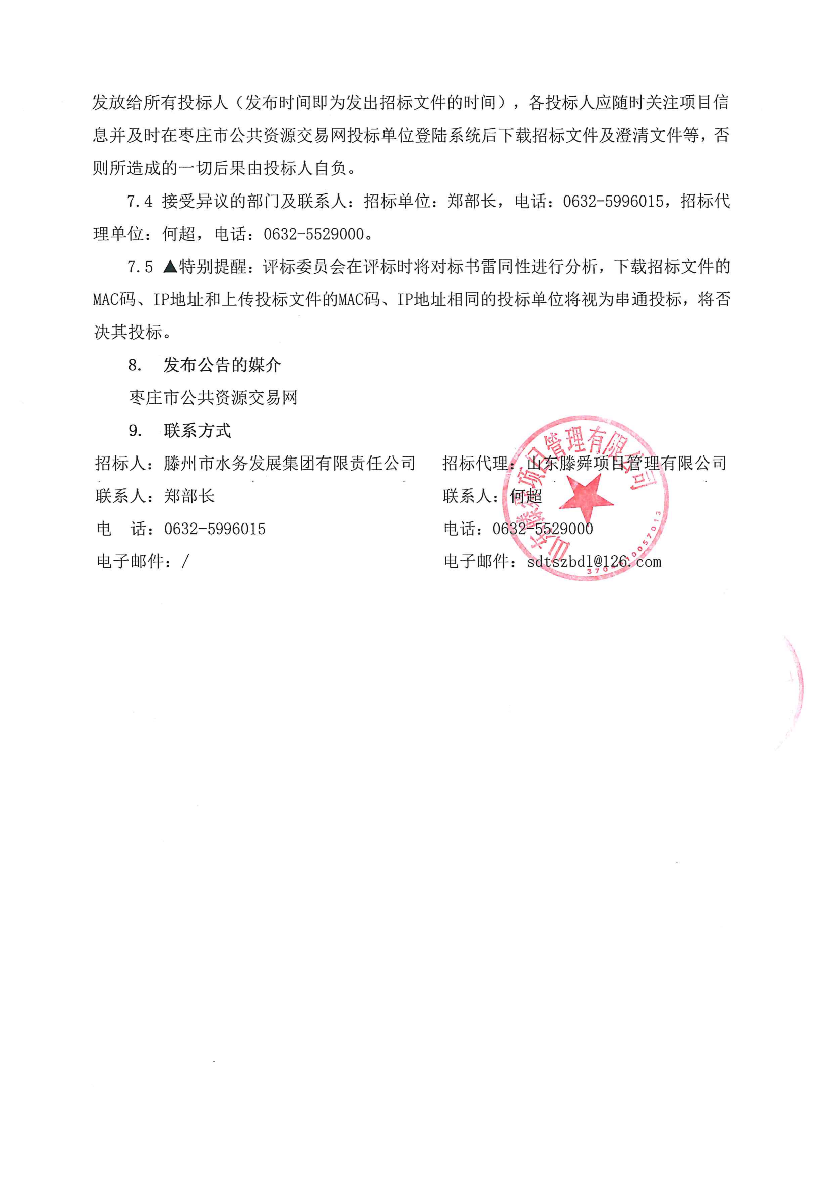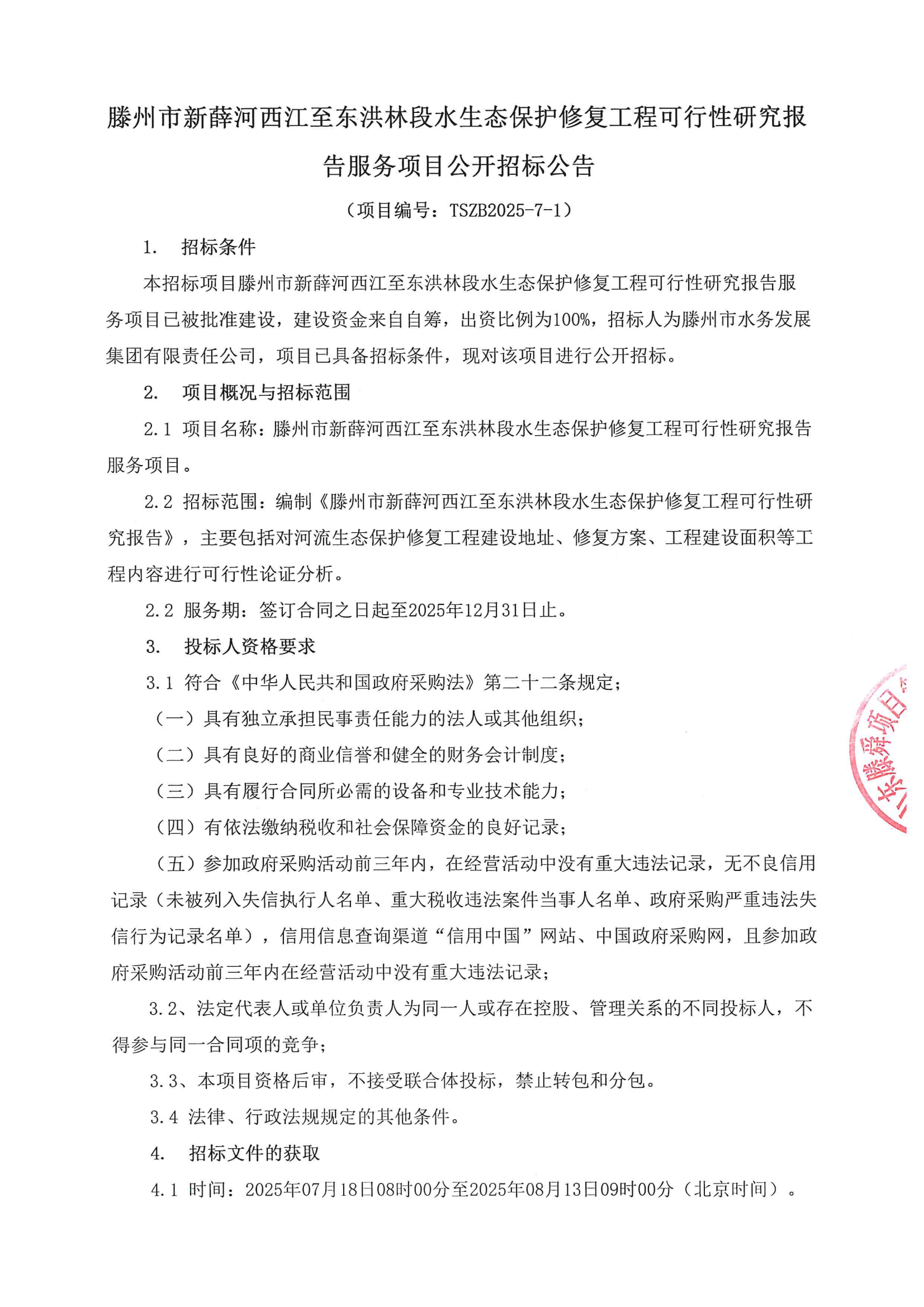 【水发集团】滕州市新薛河西江至东洪林段水生态保护修复工程可行性研究报告服务项目 日期:2025-07-17 点击: 最新推荐 【中润公司】滕州市中润供水有限公司香舍里花园四期闸阀及双偏心法兰蝶阀、球墨铸铁管件、电磁水表采购项目三标段(二次)废标公告 2025-09-11 人气:5 【中润公司】滕州市城乡供水水质提升项目管线下穿枣木高速(S83)、321省道及东木路(10K+472、18K+614)涉路工程咨询服务采购项目谈判公告 2025-09-08 人气:7 【汇通公司】水泥钢边井盖、雨水箅采购项目(二次)竞争性磋商公告 2025-09-08 人气:4 【汇通公司】水泥钢边井盖、雨水箅采购项目流标公告 2025-09-08 人气:2 【水发公司】滕州市水务发展有限公司安全技术咨询服务项目竞争性磋商公告 2025-09-08 人气:10 【国润公司】滕州市南四湖湖水东调工程--采购标招标公告 2025-09-08 人气:5 【国润公司】滕州市南四湖湖水东调工程--监理标,检测标,施工标,其他标招标公告 2025-09-08 人气:5 【中润公司】滕州市城乡供水一体化安全巩固提升工程(一期)监理标、质量检测标、设计施工总承包(EPC)招标公告 2025-09-05 人气:11 【中润公司】滕州市中润供水有限公司第一净水厂厂区标准化提升改造物料制作安装工程采购项目询价公告 2025-09-05 人气:5 【中润公司】滕州市中润供水有限公司西办公楼配电改造工程采购项目询价公告 2025-09-05 人气:3