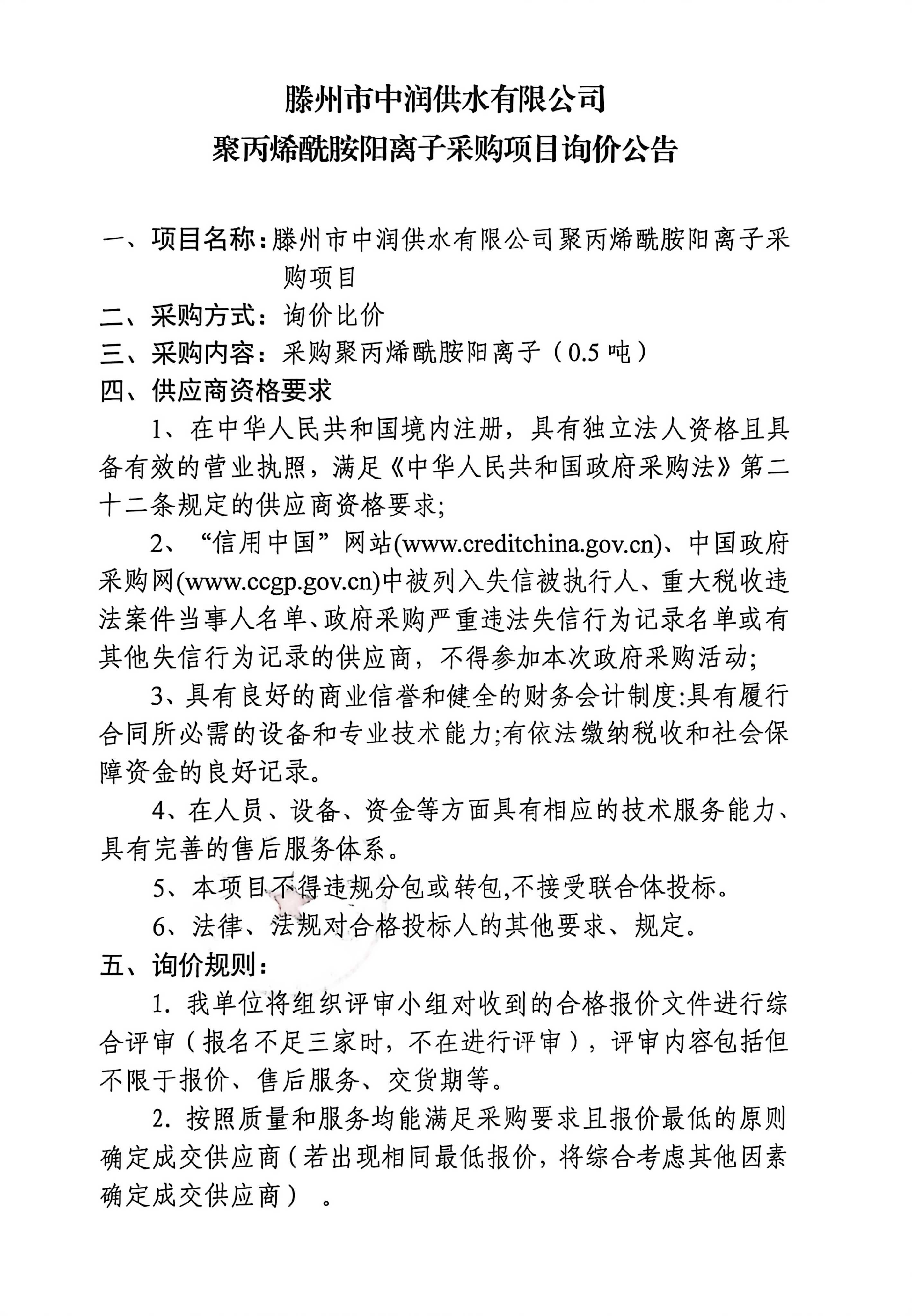 【中润公司】滕州市中润供水有限公司聚丙烯酰胺阳离子采购项目 日期:2025-07-24 点击: 最新推荐 【中润公司】滕州市中润供水有限公司香舍里花园四期闸阀及双偏心法兰蝶阀、球墨铸铁管件、电磁水表采购项目三标段(二次)废标公告 2025-09-11 人气:7 【中润公司】滕州市城乡供水水质提升项目管线下穿枣木高速(S83)、321省道及东木路(10K+472、18K+614)涉路工程咨询服务采购项目谈判公告 2025-09-08 人气:8 【汇通公司】水泥钢边井盖、雨水箅采购项目(二次)竞争性磋商公告 2025-09-08 人气:4 【汇通公司】水泥钢边井盖、雨水箅采购项目流标公告 2025-09-08 人气:2 【水发公司】滕州市水务发展有限公司安全技术咨询服务项目竞争性磋商公告 2025-09-08 人气:10 【国润公司】滕州市南四湖湖水东调工程--采购标招标公告 2025-09-08 人气:5 【国润公司】滕州市南四湖湖水东调工程--监理标,检测标,施工标,其他标招标公告 2025-09-08 人气:5 【中润公司】滕州市城乡供水一体化安全巩固提升工程(一期)监理标、质量检测标、设计施工总承包(EPC)招标公告 2025-09-05 人气:11 【中润公司】滕州市中润供水有限公司第一净水厂厂区标准化提升改造物料制作安装工程采购项目询价公告 2025-09-05 人气:5 【中润公司】滕州市中润供水有限公司西办公楼配电改造工程采购项目询价公告 2025-09-05 人气:3