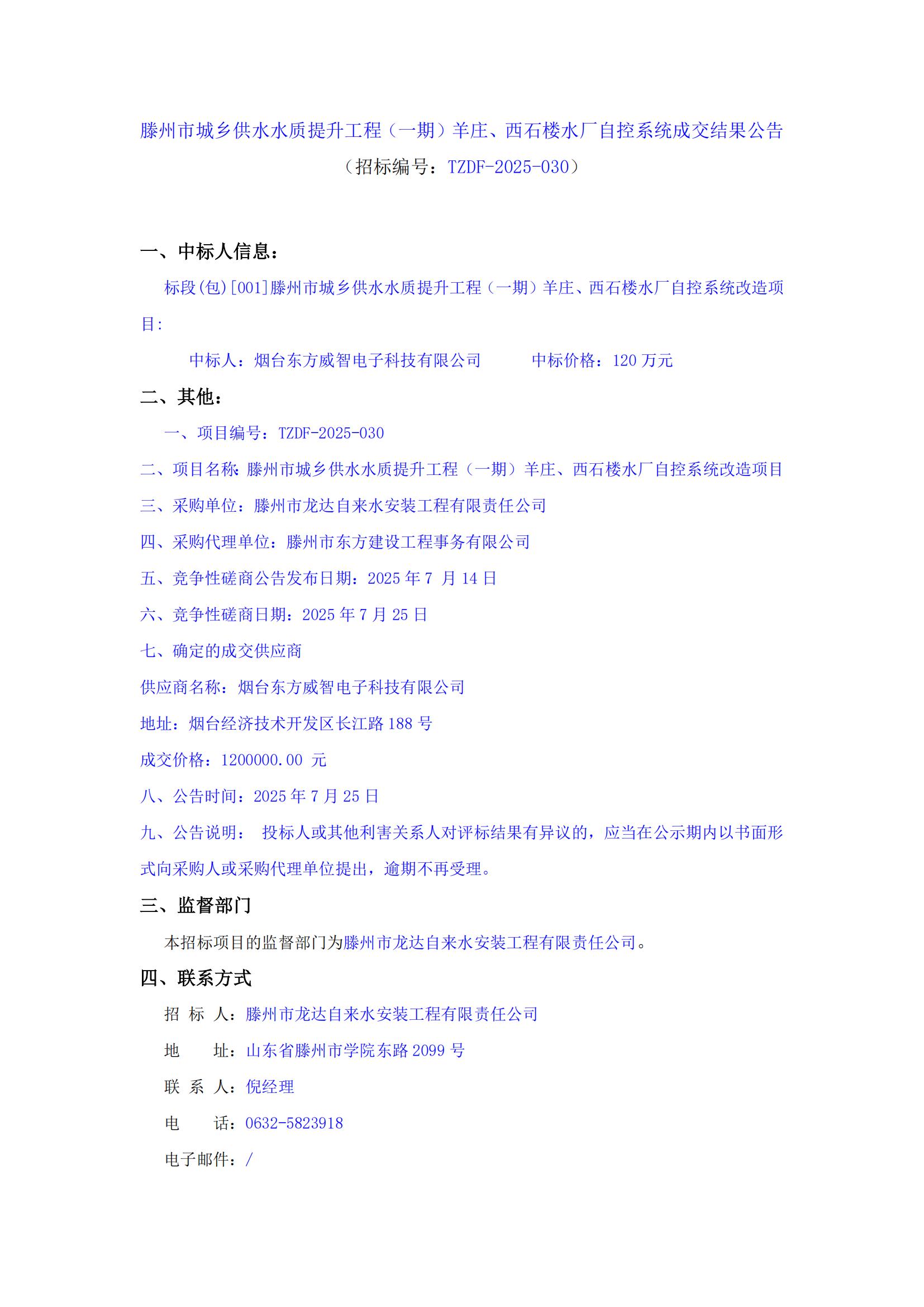 【龙达公司】滕州市城乡供水水质提升工程(一期)羊庄、西石楼水厂自控系统改造项目中标公告 日期:2025-07-25 点击: 最新推荐 【中润公司】滕州市中润供水有限公司香舍里花园四期闸阀及双偏心法兰蝶阀、球墨铸铁管件、电磁水表采购项目三标段(二次)废标公告 2025-09-11 人气:7 【中润公司】滕州市城乡供水水质提升项目管线下穿枣木高速(S83)、321省道及东木路(10K+472、18K+614)涉路工程咨询服务采购项目谈判公告 2025-09-08 人气:8 【汇通公司】水泥钢边井盖、雨水箅采购项目(二次)竞争性磋商公告 2025-09-08 人气:4 【汇通公司】水泥钢边井盖、雨水箅采购项目流标公告 2025-09-08 人气:2 【水发公司】滕州市水务发展有限公司安全技术咨询服务项目竞争性磋商公告 2025-09-08 人气:10 【国润公司】滕州市南四湖湖水东调工程--采购标招标公告 2025-09-08 人气:5 【国润公司】滕州市南四湖湖水东调工程--监理标,检测标,施工标,其他标招标公告 2025-09-08 人气:5 【中润公司】滕州市城乡供水一体化安全巩固提升工程(一期)监理标、质量检测标、设计施工总承包(EPC)招标公告 2025-09-05 人气:11 【中润公司】滕州市中润供水有限公司第一净水厂厂区标准化提升改造物料制作安装工程采购项目询价公告 2025-09-05 人气:5 【中润公司】滕州市中润供水有限公司西办公楼配电改造工程采购项目询价公告 2025-09-05 人气:3