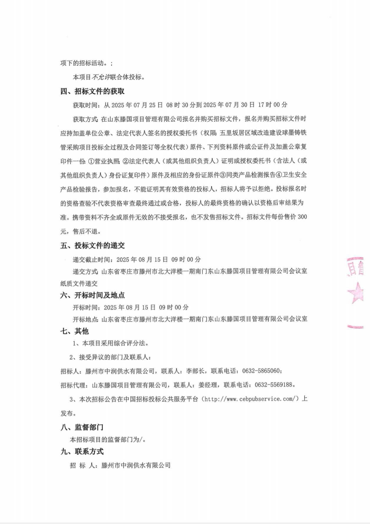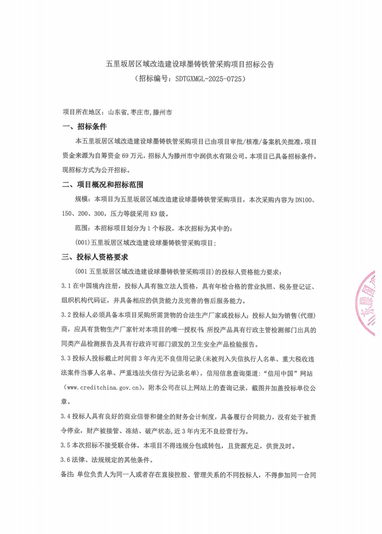 【中润公司】五里坂居区域改造建设球墨铸铁管采购项目招标公告 日期:2025-07-25 点击: 最新推荐 【中润公司】滕州市中润供水有限公司香舍里花园四期闸阀及双偏心法兰蝶阀、球墨铸铁管件、电磁水表采购项目三标段(二次)废标公告 2025-09-11 人气:7 【中润公司】滕州市城乡供水水质提升项目管线下穿枣木高速(S83)、321省道及东木路(10K+472、18K+614)涉路工程咨询服务采购项目谈判公告 2025-09-08 人气:8 【汇通公司】水泥钢边井盖、雨水箅采购项目(二次)竞争性磋商公告 2025-09-08 人气:4 【汇通公司】水泥钢边井盖、雨水箅采购项目流标公告 2025-09-08 人气:2 【水发公司】滕州市水务发展有限公司安全技术咨询服务项目竞争性磋商公告 2025-09-08 人气:10 【国润公司】滕州市南四湖湖水东调工程--采购标招标公告 2025-09-08 人气:5 【国润公司】滕州市南四湖湖水东调工程--监理标,检测标,施工标,其他标招标公告 2025-09-08 人气:5 【中润公司】滕州市城乡供水一体化安全巩固提升工程(一期)监理标、质量检测标、设计施工总承包(EPC)招标公告 2025-09-05 人气:11 【中润公司】滕州市中润供水有限公司第一净水厂厂区标准化提升改造物料制作安装工程采购项目询价公告 2025-09-05 人气:5 【中润公司】滕州市中润供水有限公司西办公楼配电改造工程采购项目询价公告 2025-09-05 人气:3