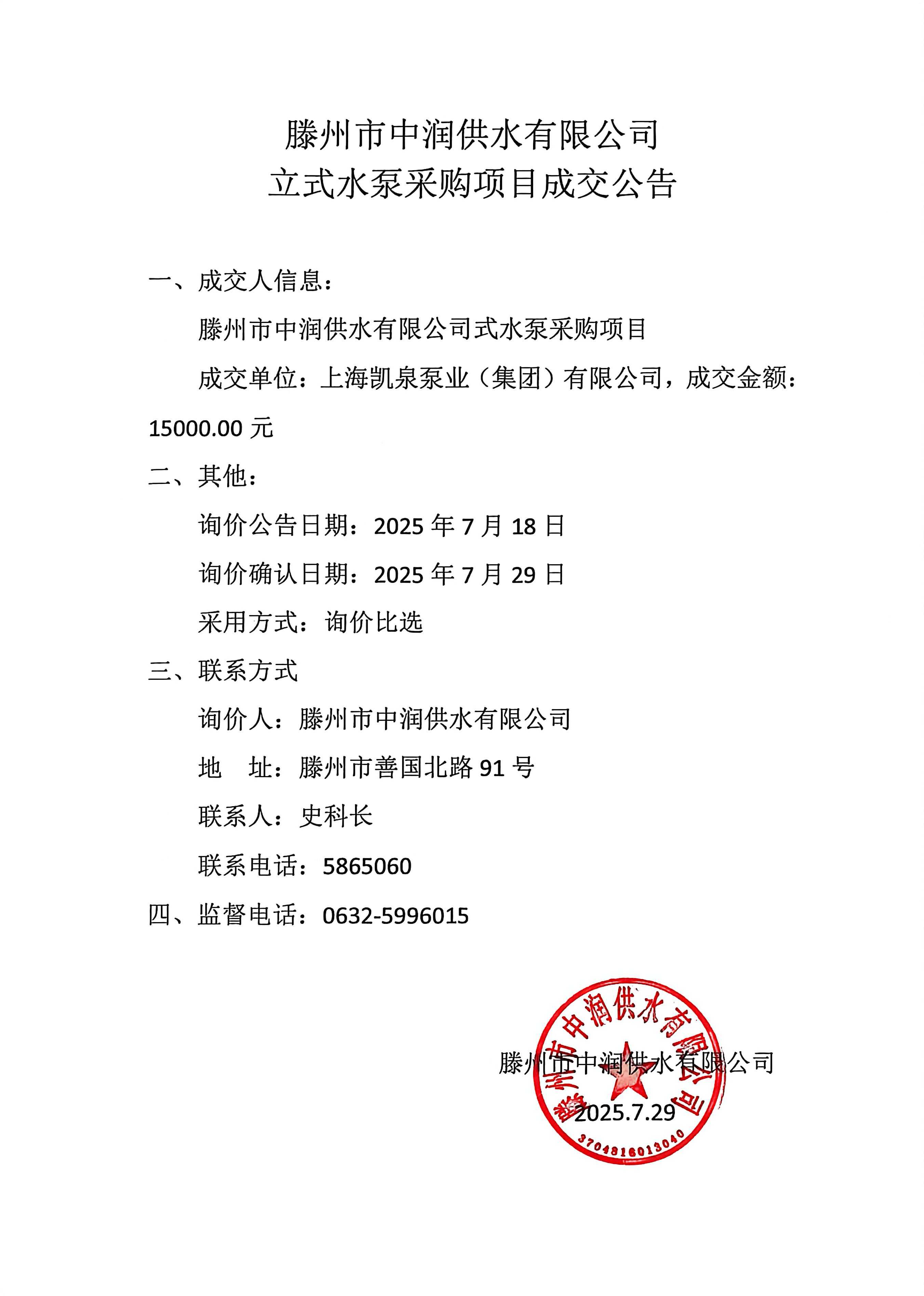【中润公司】滕州市中润供水有限公司立式水泵采购项目成交公告 日期:2025-07-31 点击: 最新推荐 【中润公司】滕州市中润供水有限公司香舍里花园四期闸阀及双偏心法兰蝶阀、球墨铸铁管件、电磁水表采购项目三标段(二次)废标公告 2025-09-11 人气:7 【中润公司】滕州市城乡供水水质提升项目管线下穿枣木高速(S83)、321省道及东木路(10K+472、18K+614)涉路工程咨询服务采购项目谈判公告 2025-09-08 人气:8 【汇通公司】水泥钢边井盖、雨水箅采购项目(二次)竞争性磋商公告 2025-09-08 人气:4 【汇通公司】水泥钢边井盖、雨水箅采购项目流标公告 2025-09-08 人气:2 【水发公司】滕州市水务发展有限公司安全技术咨询服务项目竞争性磋商公告 2025-09-08 人气:10 【国润公司】滕州市南四湖湖水东调工程--采购标招标公告 2025-09-08 人气:5 【国润公司】滕州市南四湖湖水东调工程--监理标,检测标,施工标,其他标招标公告 2025-09-08 人气:5 【中润公司】滕州市城乡供水一体化安全巩固提升工程(一期)监理标、质量检测标、设计施工总承包(EPC)招标公告 2025-09-05 人气:11 【中润公司】滕州市中润供水有限公司第一净水厂厂区标准化提升改造物料制作安装工程采购项目询价公告 2025-09-05 人气:5 【中润公司】滕州市中润供水有限公司西办公楼配电改造工程采购项目询价公告 2025-09-05 人气:3