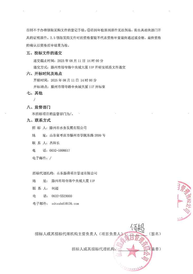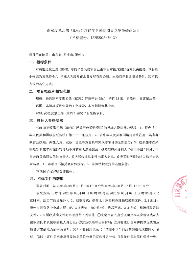 【水发公司】高密度聚乙烯(HDPE)浮筒平台采购项目磋商公告 日期:2025-07-31 点击: 最新推荐 【中润公司】滕州市中润供水有限公司香舍里花园四期闸阀及双偏心法兰蝶阀、球墨铸铁管件、电磁水表采购项目三标段(二次)废标公告 2025-09-11 人气:7 【中润公司】滕州市城乡供水水质提升项目管线下穿枣木高速(S83)、321省道及东木路(10K+472、18K+614)涉路工程咨询服务采购项目谈判公告 2025-09-08 人气:8 【汇通公司】水泥钢边井盖、雨水箅采购项目(二次)竞争性磋商公告 2025-09-08 人气:4 【汇通公司】水泥钢边井盖、雨水箅采购项目流标公告 2025-09-08 人气:2 【水发公司】滕州市水务发展有限公司安全技术咨询服务项目竞争性磋商公告 2025-09-08 人气:10 【国润公司】滕州市南四湖湖水东调工程--采购标招标公告 2025-09-08 人气:5 【国润公司】滕州市南四湖湖水东调工程--监理标,检测标,施工标,其他标招标公告 2025-09-08 人气:5 【中润公司】滕州市城乡供水一体化安全巩固提升工程(一期)监理标、质量检测标、设计施工总承包(EPC)招标公告 2025-09-05 人气:11 【中润公司】滕州市中润供水有限公司第一净水厂厂区标准化提升改造物料制作安装工程采购项目询价公告 2025-09-05 人气:5 【中润公司】滕州市中润供水有限公司西办公楼配电改造工程采购项目询价公告 2025-09-05 人气:3