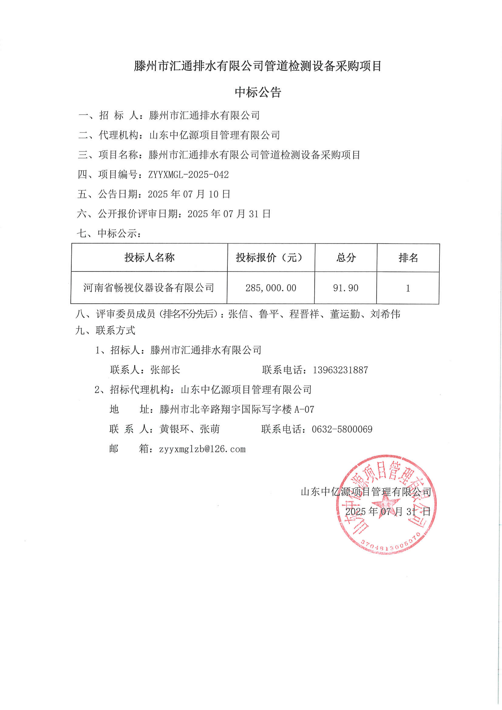 【汇通公司】管道检测设备采购项目中标公告 日期:2025-07-31 点击: 最新推荐 【中润公司】滕州市中润供水有限公司香舍里花园四期闸阀及双偏心法兰蝶阀、球墨铸铁管件、电磁水表采购项目三标段(二次)废标公告 2025-09-11 人气:7 【中润公司】滕州市城乡供水水质提升项目管线下穿枣木高速(S83)、321省道及东木路(10K+472、18K+614)涉路工程咨询服务采购项目谈判公告 2025-09-08 人气:8 【汇通公司】水泥钢边井盖、雨水箅采购项目(二次)竞争性磋商公告 2025-09-08 人气:4 【汇通公司】水泥钢边井盖、雨水箅采购项目流标公告 2025-09-08 人气:2 【水发公司】滕州市水务发展有限公司安全技术咨询服务项目竞争性磋商公告 2025-09-08 人气:10 【国润公司】滕州市南四湖湖水东调工程--采购标招标公告 2025-09-08 人气:5 【国润公司】滕州市南四湖湖水东调工程--监理标,检测标,施工标,其他标招标公告 2025-09-08 人气:5 【中润公司】滕州市城乡供水一体化安全巩固提升工程(一期)监理标、质量检测标、设计施工总承包(EPC)招标公告 2025-09-05 人气:11 【中润公司】滕州市中润供水有限公司第一净水厂厂区标准化提升改造物料制作安装工程采购项目询价公告 2025-09-05 人气:5 【中润公司】滕州市中润供水有限公司西办公楼配电改造工程采购项目询价公告 2025-09-05 人气:3