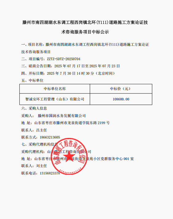 【水发公司】滕州市南四湖湖水东调工程西岗镇北环(Y111)道路施工方案论证技术咨询服务项目中标公示 日期:2025-07-31 点击: 最新推荐 【中润公司】滕州市中润供水有限公司香舍里花园四期闸阀及双偏心法兰蝶阀、球墨铸铁管件、电磁水表采购项目三标段(二次)废标公告 2025-09-11 人气:7 【中润公司】滕州市城乡供水水质提升项目管线下穿枣木高速(S83)、321省道及东木路(10K+472、18K+614)涉路工程咨询服务采购项目谈判公告 2025-09-08 人气:8 【汇通公司】水泥钢边井盖、雨水箅采购项目(二次)竞争性磋商公告 2025-09-08 人气:4 【汇通公司】水泥钢边井盖、雨水箅采购项目流标公告 2025-09-08 人气:2 【水发公司】滕州市水务发展有限公司安全技术咨询服务项目竞争性磋商公告 2025-09-08 人气:10 【国润公司】滕州市南四湖湖水东调工程--采购标招标公告 2025-09-08 人气:5 【国润公司】滕州市南四湖湖水东调工程--监理标,检测标,施工标,其他标招标公告 2025-09-08 人气:5 【中润公司】滕州市城乡供水一体化安全巩固提升工程(一期)监理标、质量检测标、设计施工总承包(EPC)招标公告 2025-09-05 人气:11 【中润公司】滕州市中润供水有限公司第一净水厂厂区标准化提升改造物料制作安装工程采购项目询价公告 2025-09-05 人气:5 【中润公司】滕州市中润供水有限公司西办公楼配电改造工程采购项目询价公告 2025-09-05 人气:3