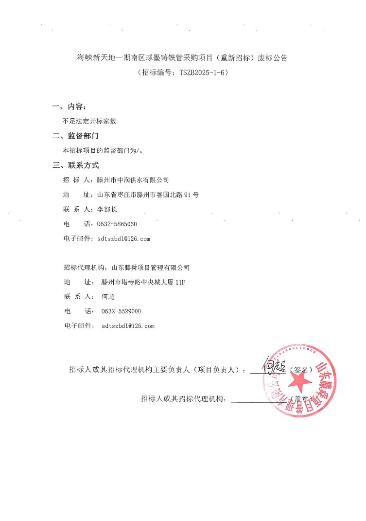 【中润公司】海峡新天地一期南区球墨铸铁管采购项目(重新招标)废标公告 日期:2025-08-04 点击: 最新推荐 【中润公司】滕州市中润供水有限公司香舍里花园四期闸阀及双偏心法兰蝶阀、球墨铸铁管件、电磁水表采购项目三标段(二次)废标公告 2025-09-11 人气:7 【中润公司】滕州市城乡供水水质提升项目管线下穿枣木高速(S83)、321省道及东木路(10K+472、18K+614)涉路工程咨询服务采购项目谈判公告 2025-09-08 人气:8 【汇通公司】水泥钢边井盖、雨水箅采购项目(二次)竞争性磋商公告 2025-09-08 人气:4 【汇通公司】水泥钢边井盖、雨水箅采购项目流标公告 2025-09-08 人气:2 【水发公司】滕州市水务发展有限公司安全技术咨询服务项目竞争性磋商公告 2025-09-08 人气:10 【国润公司】滕州市南四湖湖水东调工程--采购标招标公告 2025-09-08 人气:5 【国润公司】滕州市南四湖湖水东调工程--监理标,检测标,施工标,其他标招标公告 2025-09-08 人气:5 【中润公司】滕州市城乡供水一体化安全巩固提升工程(一期)监理标、质量检测标、设计施工总承包(EPC)招标公告 2025-09-05 人气:11 【中润公司】滕州市中润供水有限公司第一净水厂厂区标准化提升改造物料制作安装工程采购项目询价公告 2025-09-05 人气:5 【中润公司】滕州市中润供水有限公司西办公楼配电改造工程采购项目询价公告 2025-09-05 人气:3