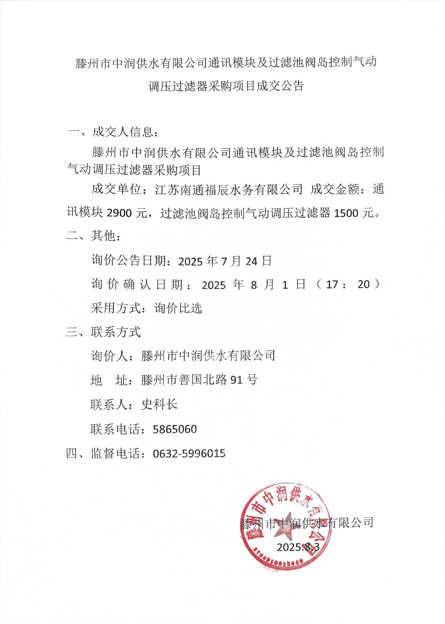 【中润公司】滕州市中润供水有限公司第三加压水厂通讯模块及第一净水厂过滤池阀岛控制气动调压过滤器采购项目成交公告 日期:2025-08-04 点击: 最新推荐 【中润公司】滕州市中润供水有限公司香舍里花园四期闸阀及双偏心法兰蝶阀、球墨铸铁管件、电磁水表采购项目三标段(二次)废标公告 2025-09-11 人气:7 【中润公司】滕州市城乡供水水质提升项目管线下穿枣木高速(S83)、321省道及东木路(10K+472、18K+614)涉路工程咨询服务采购项目谈判公告 2025-09-08 人气:8 【汇通公司】水泥钢边井盖、雨水箅采购项目(二次)竞争性磋商公告 2025-09-08 人气:4 【汇通公司】水泥钢边井盖、雨水箅采购项目流标公告 2025-09-08 人气:2 【水发公司】滕州市水务发展有限公司安全技术咨询服务项目竞争性磋商公告 2025-09-08 人气:10 【国润公司】滕州市南四湖湖水东调工程--采购标招标公告 2025-09-08 人气:5 【国润公司】滕州市南四湖湖水东调工程--监理标,检测标,施工标,其他标招标公告 2025-09-08 人气:5 【中润公司】滕州市城乡供水一体化安全巩固提升工程(一期)监理标、质量检测标、设计施工总承包(EPC)招标公告 2025-09-05 人气:11 【中润公司】滕州市中润供水有限公司第一净水厂厂区标准化提升改造物料制作安装工程采购项目询价公告 2025-09-05 人气:5 【中润公司】滕州市中润供水有限公司西办公楼配电改造工程采购项目询价公告 2025-09-05 人气:3