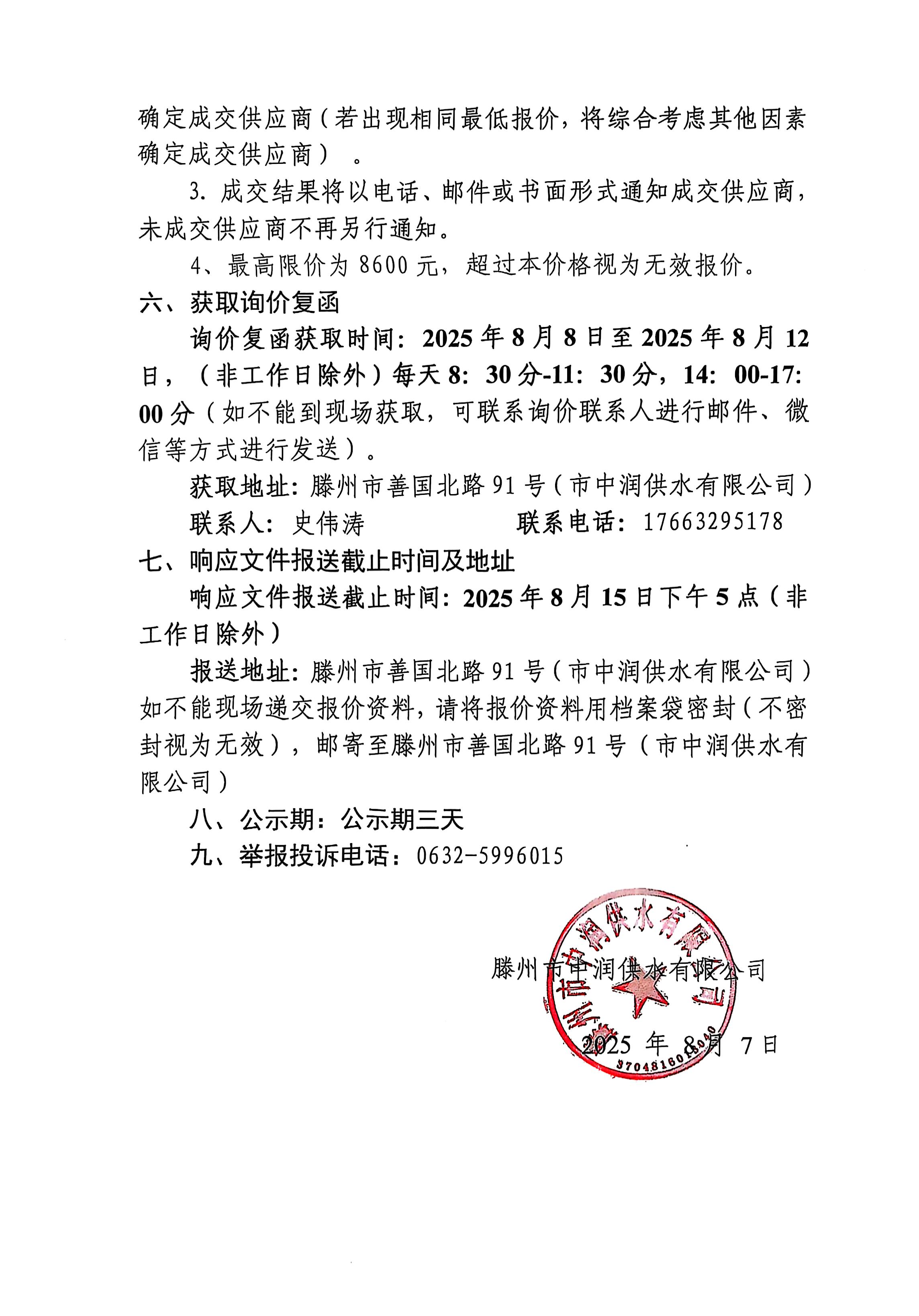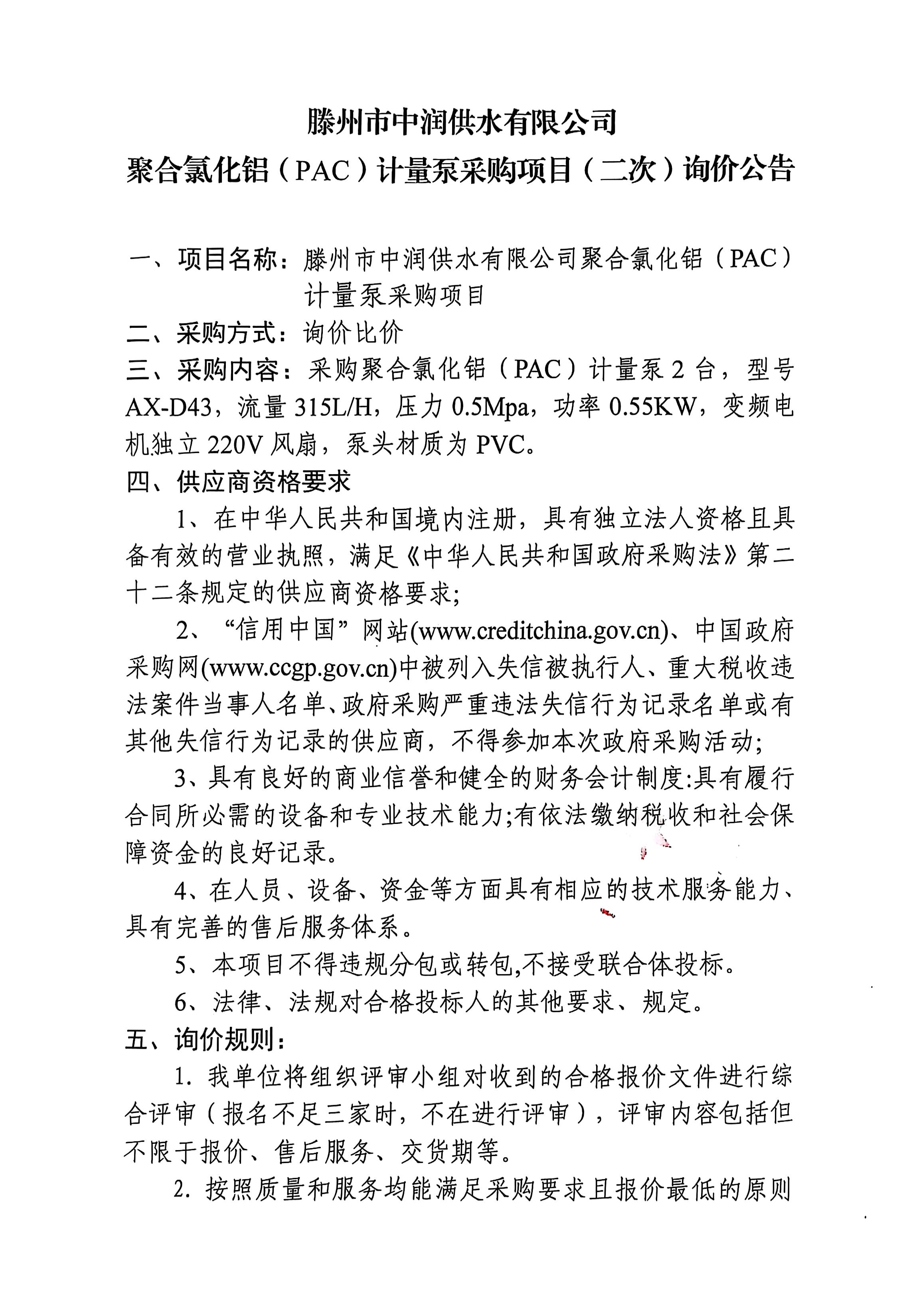 【中润公司】滕州市中润供水有限公司聚合氯化铝(PAC)计量泵采购项目(二次)询价公告 日期:2025-08-07 点击: 最新推荐 【中润公司】滕州市中润供水有限公司香舍里花园四期闸阀及双偏心法兰蝶阀、球墨铸铁管件、电磁水表采购项目三标段(二次)废标公告 2025-09-11 人气:7 【中润公司】滕州市城乡供水水质提升项目管线下穿枣木高速(S83)、321省道及东木路(10K+472、18K+614)涉路工程咨询服务采购项目谈判公告 2025-09-08 人气:8 【汇通公司】水泥钢边井盖、雨水箅采购项目(二次)竞争性磋商公告 2025-09-08 人气:4 【汇通公司】水泥钢边井盖、雨水箅采购项目流标公告 2025-09-08 人气:2 【水发公司】滕州市水务发展有限公司安全技术咨询服务项目竞争性磋商公告 2025-09-08 人气:10 【国润公司】滕州市南四湖湖水东调工程--采购标招标公告 2025-09-08 人气:5 【国润公司】滕州市南四湖湖水东调工程--监理标,检测标,施工标,其他标招标公告 2025-09-08 人气:5 【中润公司】滕州市城乡供水一体化安全巩固提升工程(一期)监理标、质量检测标、设计施工总承包(EPC)招标公告 2025-09-05 人气:11 【中润公司】滕州市中润供水有限公司第一净水厂厂区标准化提升改造物料制作安装工程采购项目询价公告 2025-09-05 人气:5 【中润公司】滕州市中润供水有限公司西办公楼配电改造工程采购项目询价公告 2025-09-05 人气:3