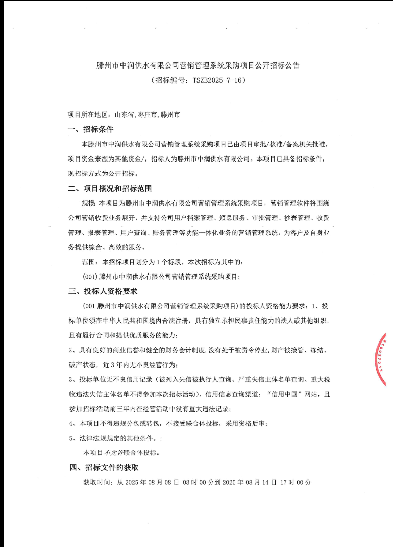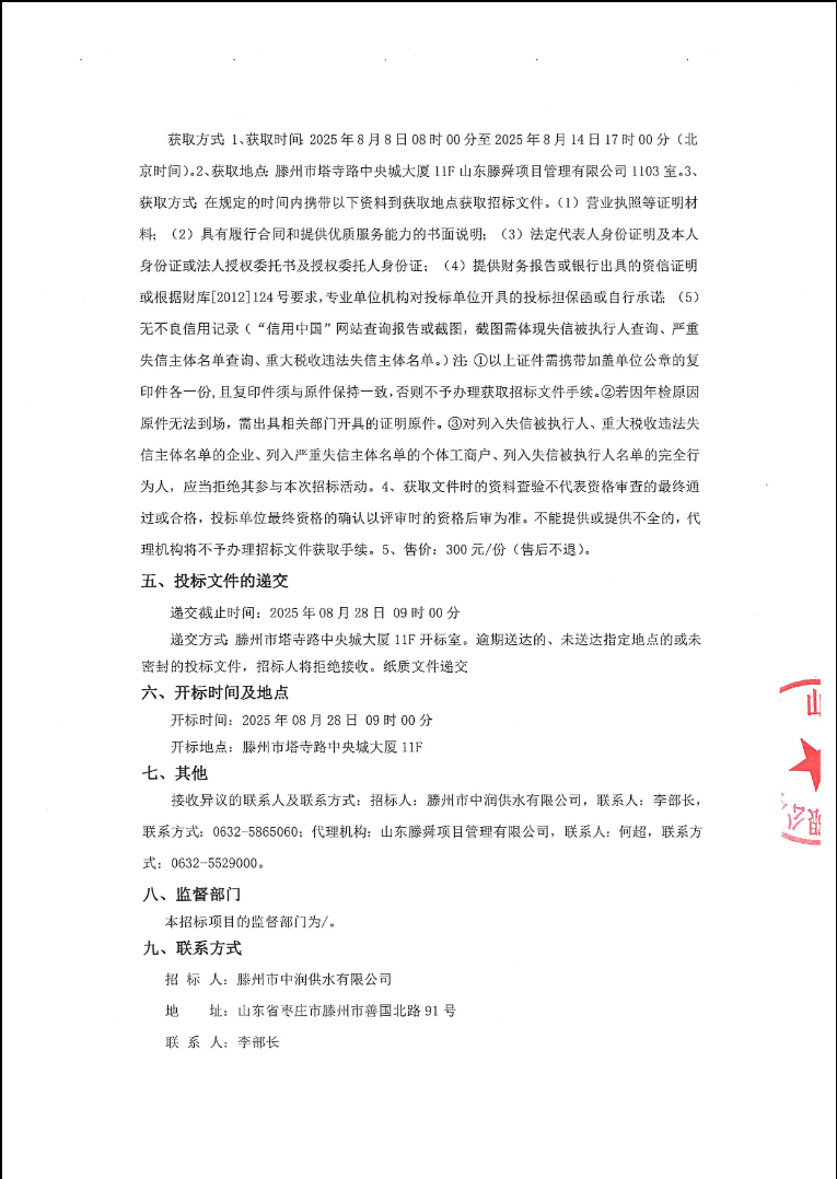 【中润公司】滕州市中润供水有限公司营销管理系统采购项目公开招标公告 日期:2025-08-08 点击: 最新推荐 【中润公司】滕州市中润供水有限公司香舍里花园四期闸阀及双偏心法兰蝶阀、球墨铸铁管件、电磁水表采购项目三标段(二次)废标公告 2025-09-11 人气:7 【中润公司】滕州市城乡供水水质提升项目管线下穿枣木高速(S83)、321省道及东木路(10K+472、18K+614)涉路工程咨询服务采购项目谈判公告 2025-09-08 人气:8 【汇通公司】水泥钢边井盖、雨水箅采购项目(二次)竞争性磋商公告 2025-09-08 人气:4 【汇通公司】水泥钢边井盖、雨水箅采购项目流标公告 2025-09-08 人气:2 【水发公司】滕州市水务发展有限公司安全技术咨询服务项目竞争性磋商公告 2025-09-08 人气:10 【国润公司】滕州市南四湖湖水东调工程--采购标招标公告 2025-09-08 人气:5 【国润公司】滕州市南四湖湖水东调工程--监理标,检测标,施工标,其他标招标公告 2025-09-08 人气:5 【中润公司】滕州市城乡供水一体化安全巩固提升工程(一期)监理标、质量检测标、设计施工总承包(EPC)招标公告 2025-09-05 人气:11 【中润公司】滕州市中润供水有限公司第一净水厂厂区标准化提升改造物料制作安装工程采购项目询价公告 2025-09-05 人气:5 【中润公司】滕州市中润供水有限公司西办公楼配电改造工程采购项目询价公告 2025-09-05 人气:3