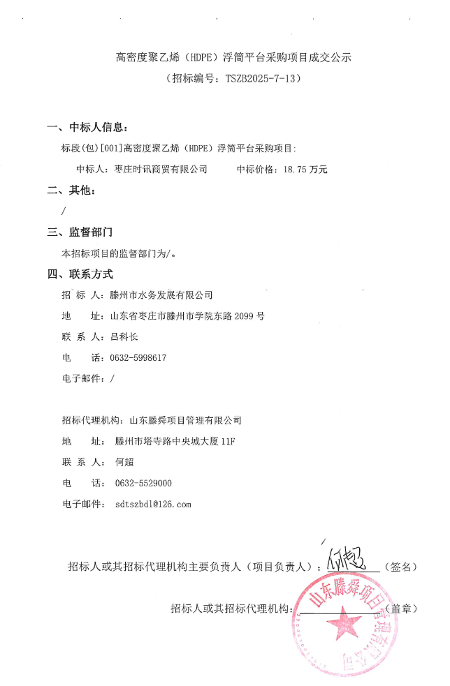 【水发公司】高密度聚乙烯(HDPE)浮筒平台采购项目成交公示 日期:2025-08-12 点击: 最新推荐 【中润公司】滕州市中润供水有限公司香舍里花园四期闸阀及双偏心法兰蝶阀、球墨铸铁管件、电磁水表采购项目三标段(二次)废标公告 2025-09-11 人气:7 【中润公司】滕州市城乡供水水质提升项目管线下穿枣木高速(S83)、321省道及东木路(10K+472、18K+614)涉路工程咨询服务采购项目谈判公告 2025-09-08 人气:8 【汇通公司】水泥钢边井盖、雨水箅采购项目(二次)竞争性磋商公告 2025-09-08 人气:4 【汇通公司】水泥钢边井盖、雨水箅采购项目流标公告 2025-09-08 人气:2 【水发公司】滕州市水务发展有限公司安全技术咨询服务项目竞争性磋商公告 2025-09-08 人气:10 【国润公司】滕州市南四湖湖水东调工程--采购标招标公告 2025-09-08 人气:5 【国润公司】滕州市南四湖湖水东调工程--监理标,检测标,施工标,其他标招标公告 2025-09-08 人气:5 【中润公司】滕州市城乡供水一体化安全巩固提升工程(一期)监理标、质量检测标、设计施工总承包(EPC)招标公告 2025-09-05 人气:11 【中润公司】滕州市中润供水有限公司第一净水厂厂区标准化提升改造物料制作安装工程采购项目询价公告 2025-09-05 人气:5 【中润公司】滕州市中润供水有限公司西办公楼配电改造工程采购项目询价公告 2025-09-05 人气:3