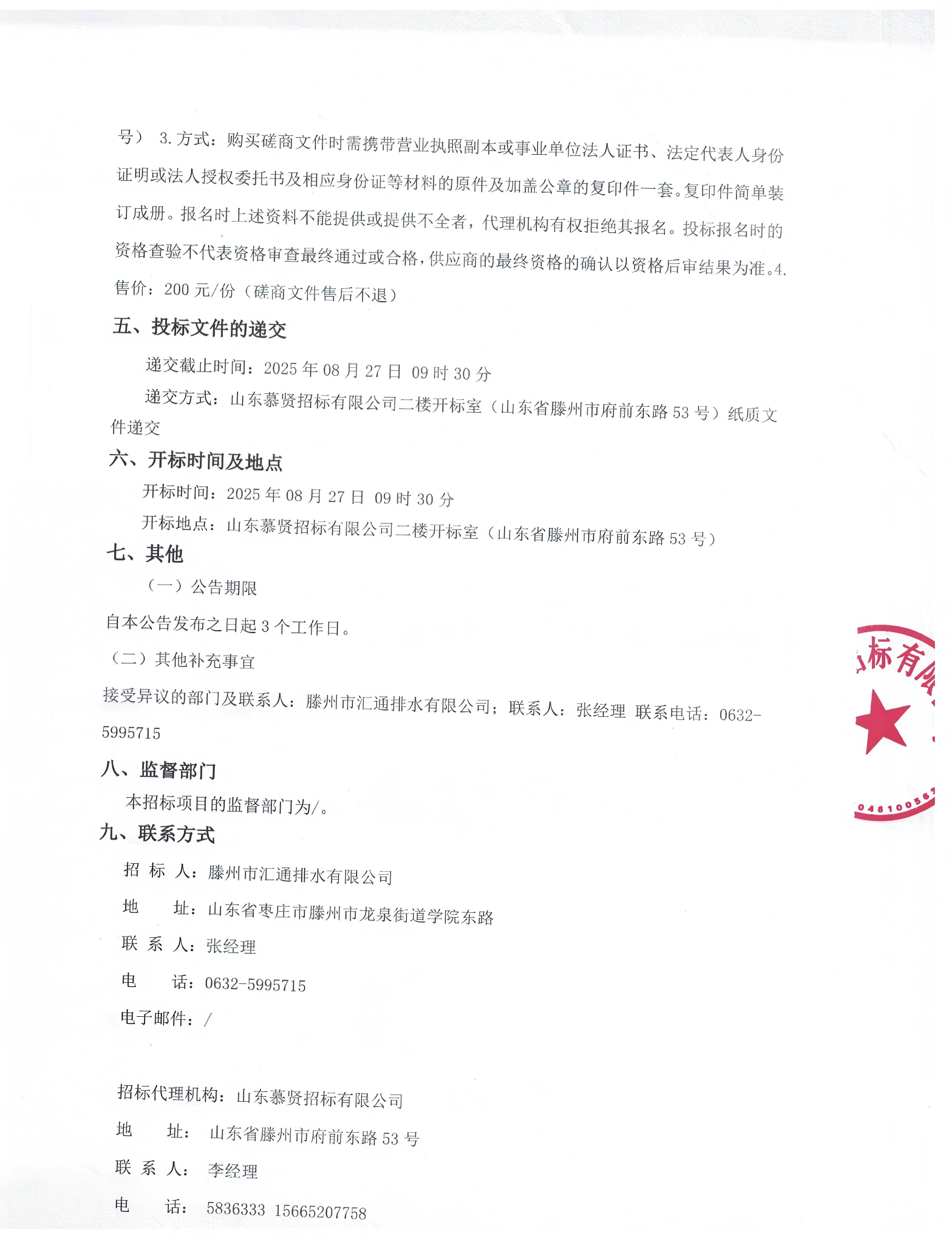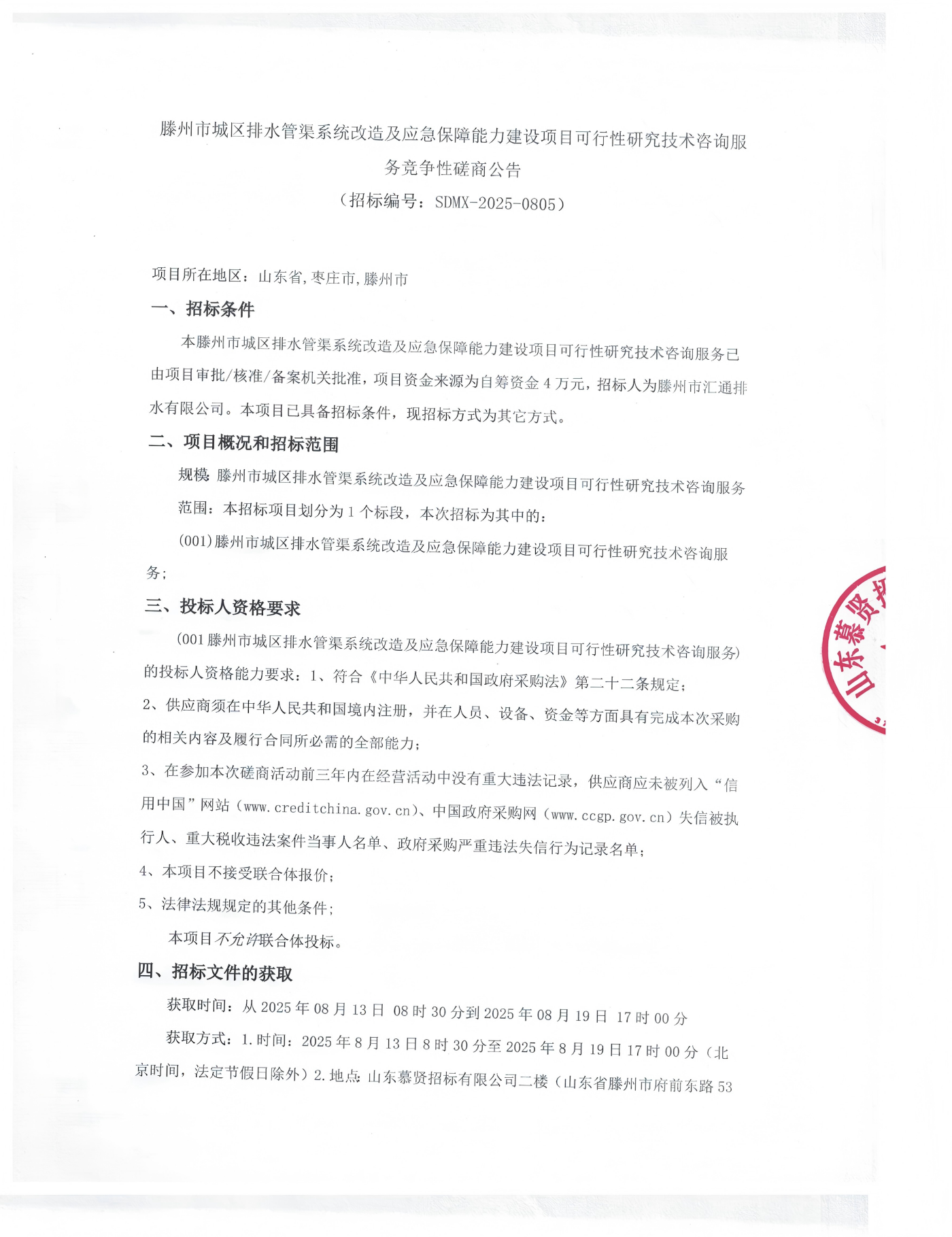 【汇通公司】滕州市城区排水管渠系统改造及应急保障能力建设项目可行性研究技术咨询服务竞争性磋商公告 日期:2025-08-12 点击: 最新推荐 【中润公司】滕州市中润供水有限公司香舍里花园四期闸阀及双偏心法兰蝶阀、球墨铸铁管件、电磁水表采购项目三标段(二次)废标公告 2025-09-11 人气:7 【中润公司】滕州市城乡供水水质提升项目管线下穿枣木高速(S83)、321省道及东木路(10K+472、18K+614)涉路工程咨询服务采购项目谈判公告 2025-09-08 人气:8 【汇通公司】水泥钢边井盖、雨水箅采购项目(二次)竞争性磋商公告 2025-09-08 人气:4 【汇通公司】水泥钢边井盖、雨水箅采购项目流标公告 2025-09-08 人气:2 【水发公司】滕州市水务发展有限公司安全技术咨询服务项目竞争性磋商公告 2025-09-08 人气:10 【国润公司】滕州市南四湖湖水东调工程--采购标招标公告 2025-09-08 人气:5 【国润公司】滕州市南四湖湖水东调工程--监理标,检测标,施工标,其他标招标公告 2025-09-08 人气:5 【中润公司】滕州市城乡供水一体化安全巩固提升工程(一期)监理标、质量检测标、设计施工总承包(EPC)招标公告 2025-09-05 人气:11 【中润公司】滕州市中润供水有限公司第一净水厂厂区标准化提升改造物料制作安装工程采购项目询价公告 2025-09-05 人气:5 【中润公司】滕州市中润供水有限公司西办公楼配电改造工程采购项目询价公告 2025-09-05 人气:3