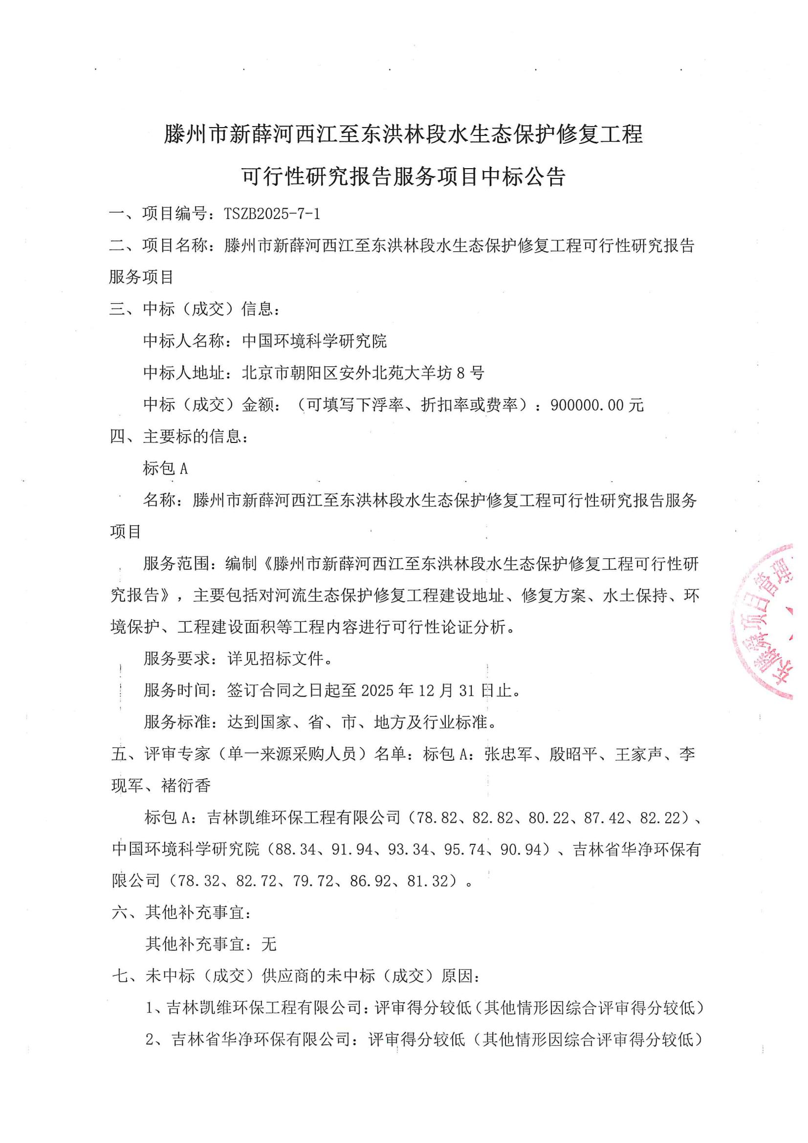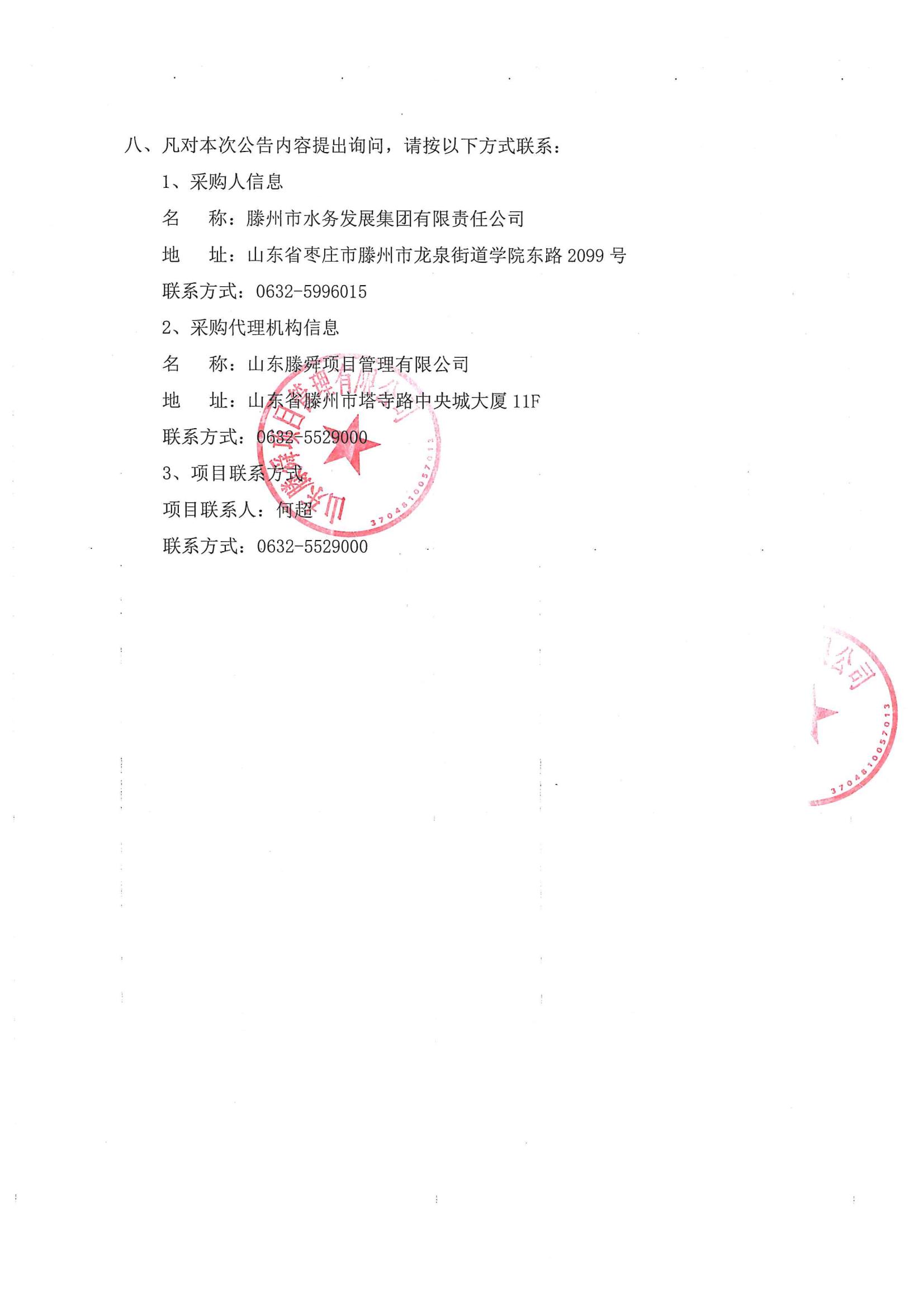【水发集团】滕州市新薛河西江至东洪林段水生态保护修复工程可行性研究报告服务项目中标公告 日期:2025-08-13 点击: 最新推荐 【中润公司】滕州市中润供水有限公司香舍里花园四期闸阀及双偏心法兰蝶阀、球墨铸铁管件、电磁水表采购项目三标段(二次)废标公告 2025-09-11 人气:7 【中润公司】滕州市城乡供水水质提升项目管线下穿枣木高速(S83)、321省道及东木路(10K+472、18K+614)涉路工程咨询服务采购项目谈判公告 2025-09-08 人气:8 【汇通公司】水泥钢边井盖、雨水箅采购项目(二次)竞争性磋商公告 2025-09-08 人气:4 【汇通公司】水泥钢边井盖、雨水箅采购项目流标公告 2025-09-08 人气:2 【水发公司】滕州市水务发展有限公司安全技术咨询服务项目竞争性磋商公告 2025-09-08 人气:10 【国润公司】滕州市南四湖湖水东调工程--采购标招标公告 2025-09-08 人气:5 【国润公司】滕州市南四湖湖水东调工程--监理标,检测标,施工标,其他标招标公告 2025-09-08 人气:5 【中润公司】滕州市城乡供水一体化安全巩固提升工程(一期)监理标、质量检测标、设计施工总承包(EPC)招标公告 2025-09-05 人气:11 【中润公司】滕州市中润供水有限公司第一净水厂厂区标准化提升改造物料制作安装工程采购项目询价公告 2025-09-05 人气:5 【中润公司】滕州市中润供水有限公司西办公楼配电改造工程采购项目询价公告 2025-09-05 人气:3