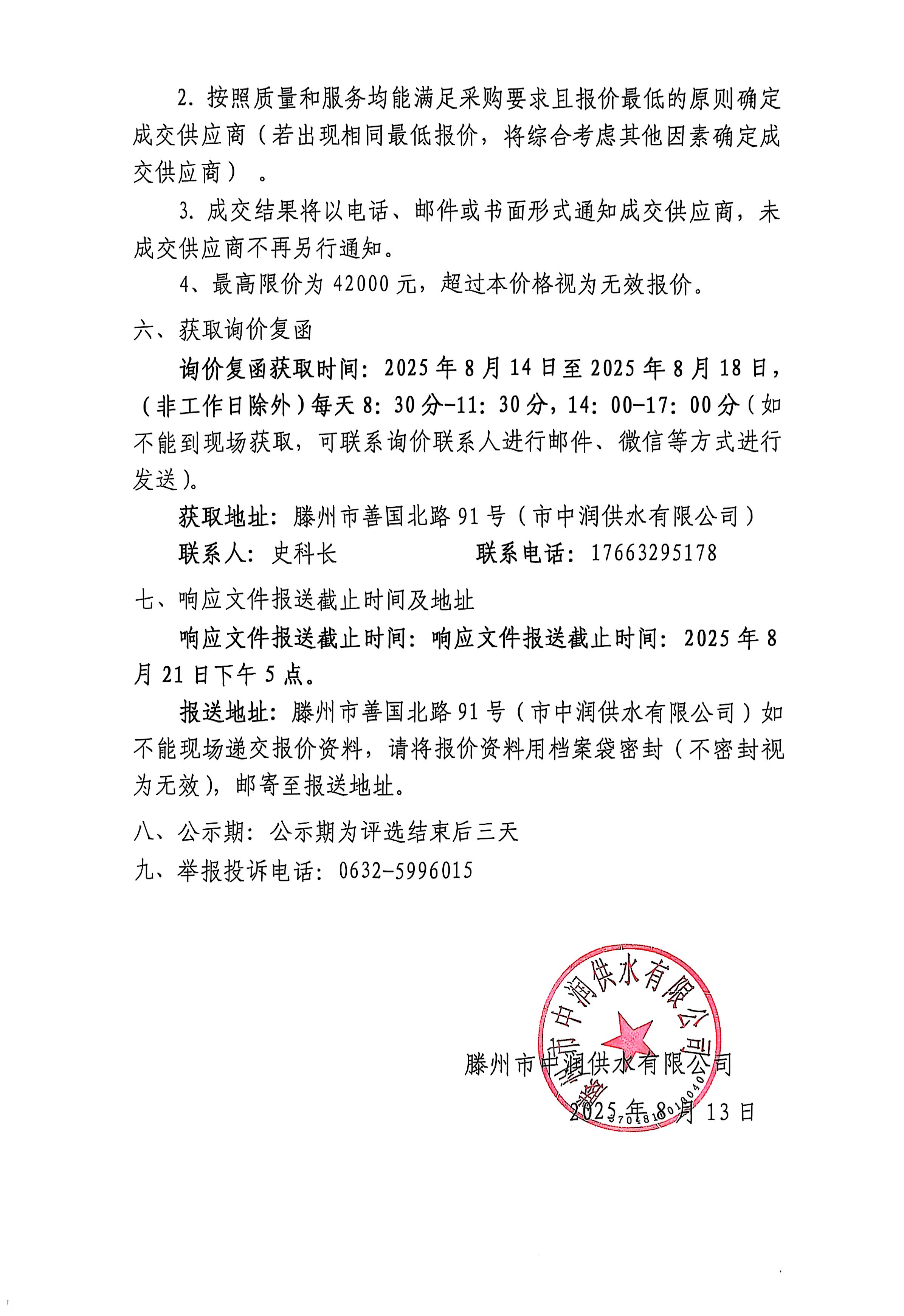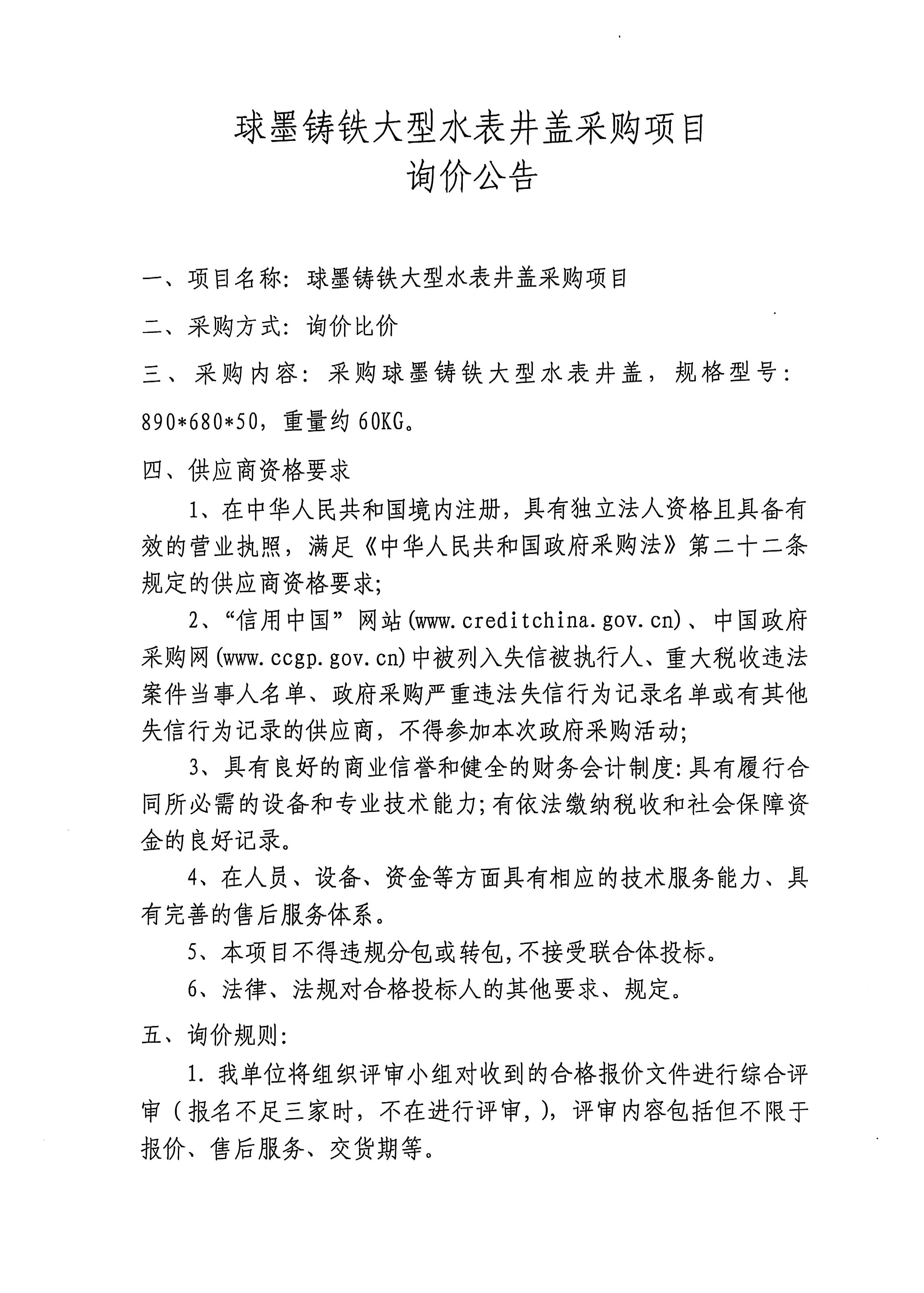 【中润公司】球墨铸铁大型水表井盖采购项目询价公告 日期:2025-08-14 点击: 最新推荐 【中润公司】滕州市中润供水有限公司香舍里花园四期闸阀及双偏心法兰蝶阀、球墨铸铁管件、电磁水表采购项目三标段(二次)废标公告 2025-09-11 人气:7 【中润公司】滕州市城乡供水水质提升项目管线下穿枣木高速(S83)、321省道及东木路(10K+472、18K+614)涉路工程咨询服务采购项目谈判公告 2025-09-08 人气:8 【汇通公司】水泥钢边井盖、雨水箅采购项目(二次)竞争性磋商公告 2025-09-08 人气:4 【汇通公司】水泥钢边井盖、雨水箅采购项目流标公告 2025-09-08 人气:2 【水发公司】滕州市水务发展有限公司安全技术咨询服务项目竞争性磋商公告 2025-09-08 人气:10 【国润公司】滕州市南四湖湖水东调工程--采购标招标公告 2025-09-08 人气:5 【国润公司】滕州市南四湖湖水东调工程--监理标,检测标,施工标,其他标招标公告 2025-09-08 人气:5 【中润公司】滕州市城乡供水一体化安全巩固提升工程(一期)监理标、质量检测标、设计施工总承包(EPC)招标公告 2025-09-05 人气:11 【中润公司】滕州市中润供水有限公司第一净水厂厂区标准化提升改造物料制作安装工程采购项目询价公告 2025-09-05 人气:5 【中润公司】滕州市中润供水有限公司西办公楼配电改造工程采购项目询价公告 2025-09-05 人气:3