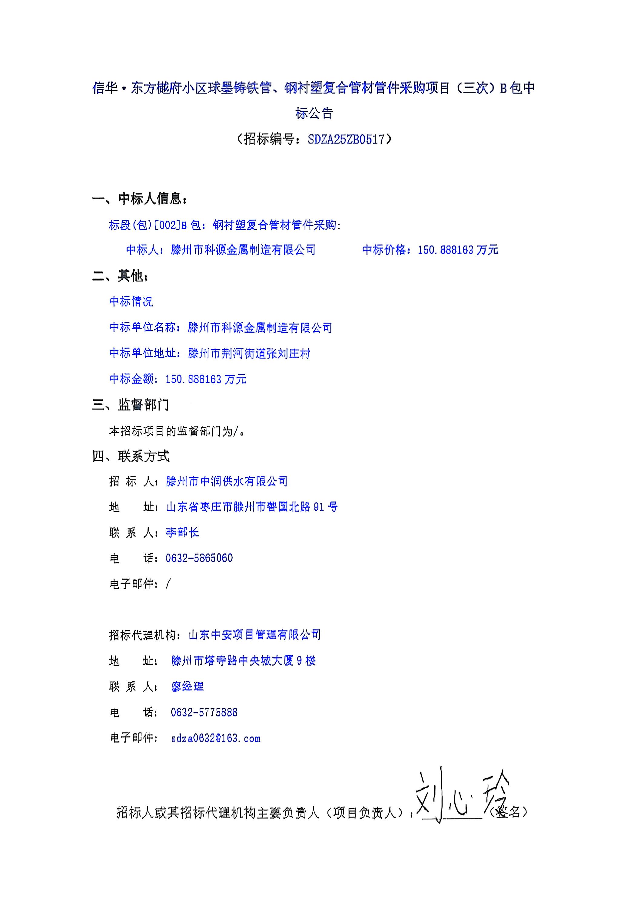 【中润公司】信华·东方樾府小区球墨铸铁管、钢衬塑复合管材管件采购项目(三次)B包中标公告 日期:2025-08-18 点击: 最新推荐 【中润公司】滕州市中润供水有限公司香舍里花园四期闸阀及双偏心法兰蝶阀、球墨铸铁管件、电磁水表采购项目三标段(二次)废标公告 2025-09-11 人气:7 【中润公司】滕州市城乡供水水质提升项目管线下穿枣木高速(S83)、321省道及东木路(10K+472、18K+614)涉路工程咨询服务采购项目谈判公告 2025-09-08 人气:8 【汇通公司】水泥钢边井盖、雨水箅采购项目(二次)竞争性磋商公告 2025-09-08 人气:4 【汇通公司】水泥钢边井盖、雨水箅采购项目流标公告 2025-09-08 人气:2 【水发公司】滕州市水务发展有限公司安全技术咨询服务项目竞争性磋商公告 2025-09-08 人气:10 【国润公司】滕州市南四湖湖水东调工程--采购标招标公告 2025-09-08 人气:5 【国润公司】滕州市南四湖湖水东调工程--监理标,检测标,施工标,其他标招标公告 2025-09-08 人气:5 【中润公司】滕州市城乡供水一体化安全巩固提升工程(一期)监理标、质量检测标、设计施工总承包(EPC)招标公告 2025-09-05 人气:11 【中润公司】滕州市中润供水有限公司第一净水厂厂区标准化提升改造物料制作安装工程采购项目询价公告 2025-09-05 人气:5 【中润公司】滕州市中润供水有限公司西办公楼配电改造工程采购项目询价公告 2025-09-05 人气:3