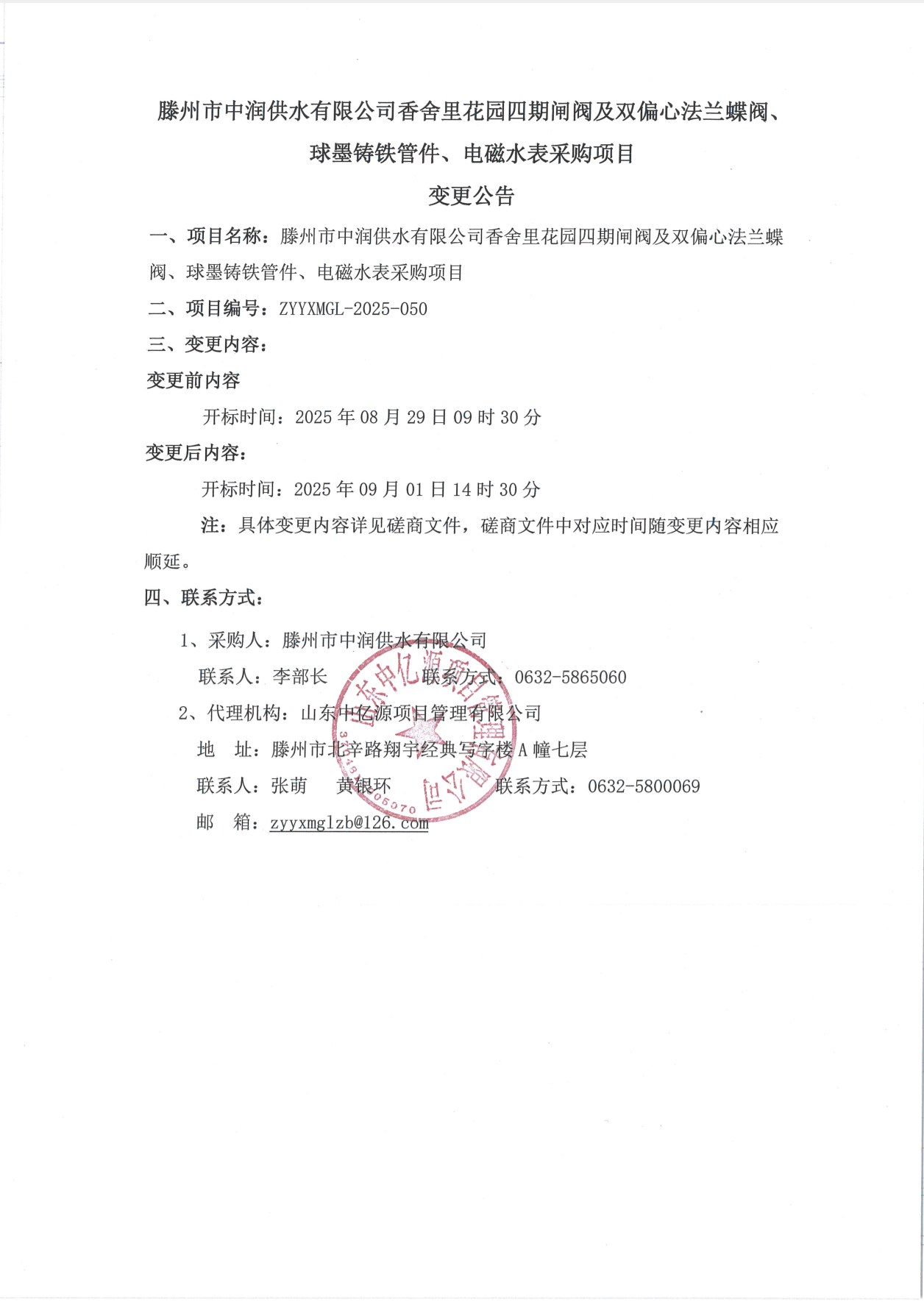 【中润公司】滕州市中润供水有限公司香舍里花园四期闸阀及双偏心法兰蝶阀、球墨铸铁管件、电磁水表采购项目变更公告 日期:2025-08-25 点击: 最新推荐 【中润公司】滕州市中润供水有限公司香舍里花园四期闸阀及双偏心法兰蝶阀、球墨铸铁管件、电磁水表采购项目三标段(二次)废标公告 2025-09-11 人气:7 【中润公司】滕州市城乡供水水质提升项目管线下穿枣木高速(S83)、321省道及东木路(10K+472、18K+614)涉路工程咨询服务采购项目谈判公告 2025-09-08 人气:8 【汇通公司】水泥钢边井盖、雨水箅采购项目(二次)竞争性磋商公告 2025-09-08 人气:4 【汇通公司】水泥钢边井盖、雨水箅采购项目流标公告 2025-09-08 人气:2 【水发公司】滕州市水务发展有限公司安全技术咨询服务项目竞争性磋商公告 2025-09-08 人气:10 【国润公司】滕州市南四湖湖水东调工程--采购标招标公告 2025-09-08 人气:5 【国润公司】滕州市南四湖湖水东调工程--监理标,检测标,施工标,其他标招标公告 2025-09-08 人气:5 【中润公司】滕州市城乡供水一体化安全巩固提升工程(一期)监理标、质量检测标、设计施工总承包(EPC)招标公告 2025-09-05 人气:11 【中润公司】滕州市中润供水有限公司第一净水厂厂区标准化提升改造物料制作安装工程采购项目询价公告 2025-09-05 人气:5 【中润公司】滕州市中润供水有限公司西办公楼配电改造工程采购项目询价公告 2025-09-05 人气:3
