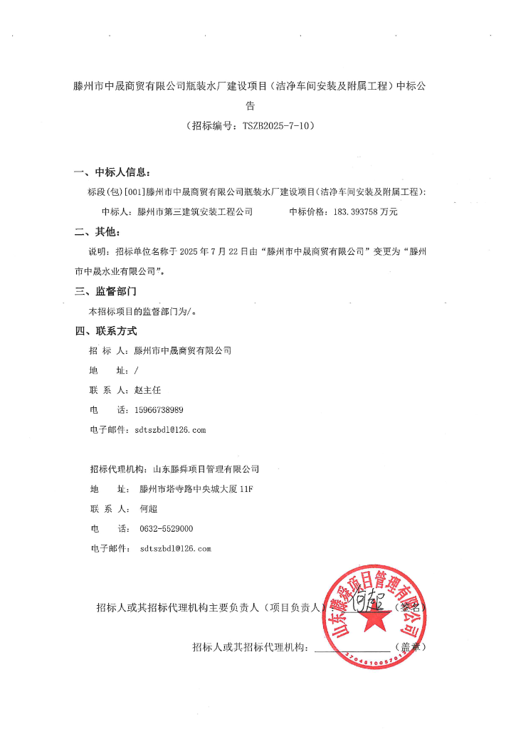https://ctbpsp.com/#/bulletinDetail?uuid=c305e13c-6c54-407b-8bab-e43f59ac3d94&inpvalue=%E6%BB%95%E5%B7%9E%E5%B8%82%E4%B8%AD%E6%99%9F%E5%95%86%E8%B4%B8%E6%9C%89%E9%99%90%E5%85%AC%E5%8F%B8%E7%93%B6%E8%A3%85%E6%B0%B4%E5%8E%82%E5%BB%BA%E8%AE%BE%E9%A1%B9%E7%9B%AE%EF%BC%88%E6%B4%81%E5%87%80%E8%BD%A6%E9%97%B4%E5%AE%89%E8%A3%85%E5%8F%8A%E9%99%84%E5%B1%9E%E5%B7%A5%E7%A8%8B%EF%BC%89&dataSource=0&tenderAgency=