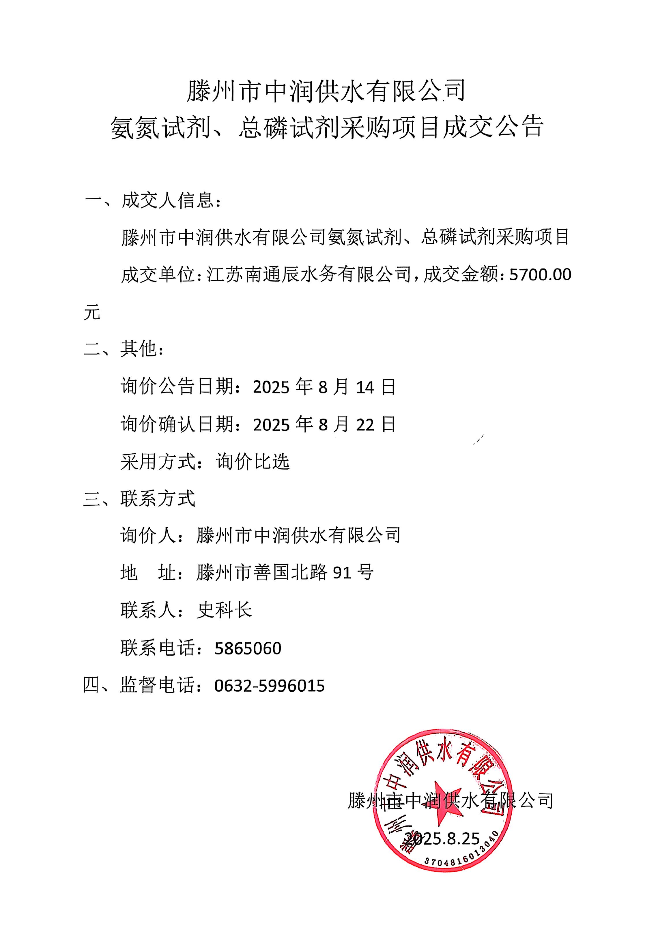 【中润公司】东沙河地表水厂氨氮试剂、总磷试剂采购项目成交公告 日期:2025-08-27 点击: 最新推荐 【中润公司】滕州市中润供水有限公司香舍里花园四期闸阀及双偏心法兰蝶阀、球墨铸铁管件、电磁水表采购项目三标段(二次)废标公告 2025-09-11 人气:7 【中润公司】滕州市城乡供水水质提升项目管线下穿枣木高速(S83)、321省道及东木路(10K+472、18K+614)涉路工程咨询服务采购项目谈判公告 2025-09-08 人气:8 【汇通公司】水泥钢边井盖、雨水箅采购项目(二次)竞争性磋商公告 2025-09-08 人气:4 【汇通公司】水泥钢边井盖、雨水箅采购项目流标公告 2025-09-08 人气:2 【水发公司】滕州市水务发展有限公司安全技术咨询服务项目竞争性磋商公告 2025-09-08 人气:10 【国润公司】滕州市南四湖湖水东调工程--采购标招标公告 2025-09-08 人气:5 【国润公司】滕州市南四湖湖水东调工程--监理标,检测标,施工标,其他标招标公告 2025-09-08 人气:5 【中润公司】滕州市城乡供水一体化安全巩固提升工程(一期)监理标、质量检测标、设计施工总承包(EPC)招标公告 2025-09-05 人气:11 【中润公司】滕州市中润供水有限公司第一净水厂厂区标准化提升改造物料制作安装工程采购项目询价公告 2025-09-05 人气:5 【中润公司】滕州市中润供水有限公司西办公楼配电改造工程采购项目询价公告 2025-09-05 人气:3