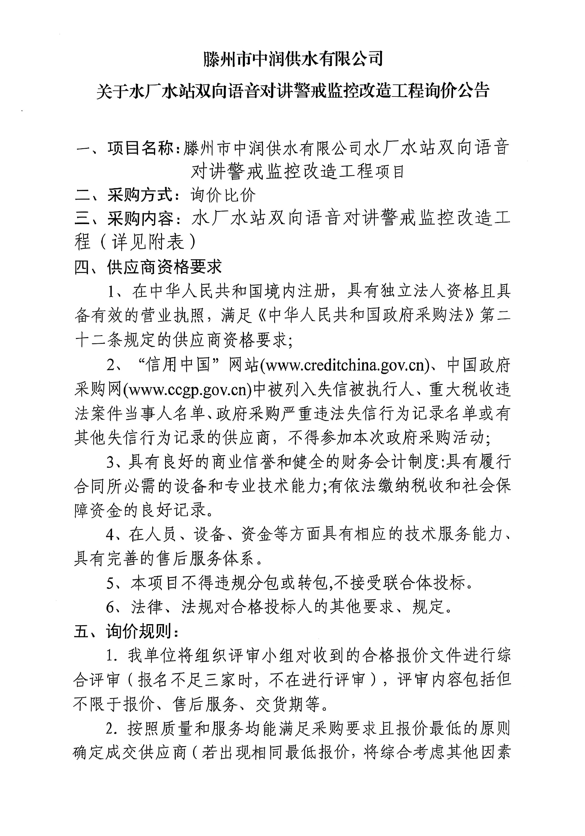 【中润公司】滕州市中润供水有限公司关于水厂水站双向语音对讲警戒监控改造工程询价公告 日期:2025-08-27 点击: 最新推荐 【中润公司】滕州市中润供水有限公司香舍里花园四期闸阀及双偏心法兰蝶阀、球墨铸铁管件、电磁水表采购项目三标段(二次)废标公告 2025-09-11 人气:7 【中润公司】滕州市城乡供水水质提升项目管线下穿枣木高速(S83)、321省道及东木路(10K+472、18K+614)涉路工程咨询服务采购项目谈判公告 2025-09-08 人气:8 【汇通公司】水泥钢边井盖、雨水箅采购项目(二次)竞争性磋商公告 2025-09-08 人气:4 【汇通公司】水泥钢边井盖、雨水箅采购项目流标公告 2025-09-08 人气:2 【水发公司】滕州市水务发展有限公司安全技术咨询服务项目竞争性磋商公告 2025-09-08 人气:10 【国润公司】滕州市南四湖湖水东调工程--采购标招标公告 2025-09-08 人气:5 【国润公司】滕州市南四湖湖水东调工程--监理标,检测标,施工标,其他标招标公告 2025-09-08 人气:5 【中润公司】滕州市城乡供水一体化安全巩固提升工程(一期)监理标、质量检测标、设计施工总承包(EPC)招标公告 2025-09-05 人气:11 【中润公司】滕州市中润供水有限公司第一净水厂厂区标准化提升改造物料制作安装工程采购项目询价公告 2025-09-05 人气:5 【中润公司】滕州市中润供水有限公司西办公楼配电改造工程采购项目询价公告 2025-09-05 人气:3