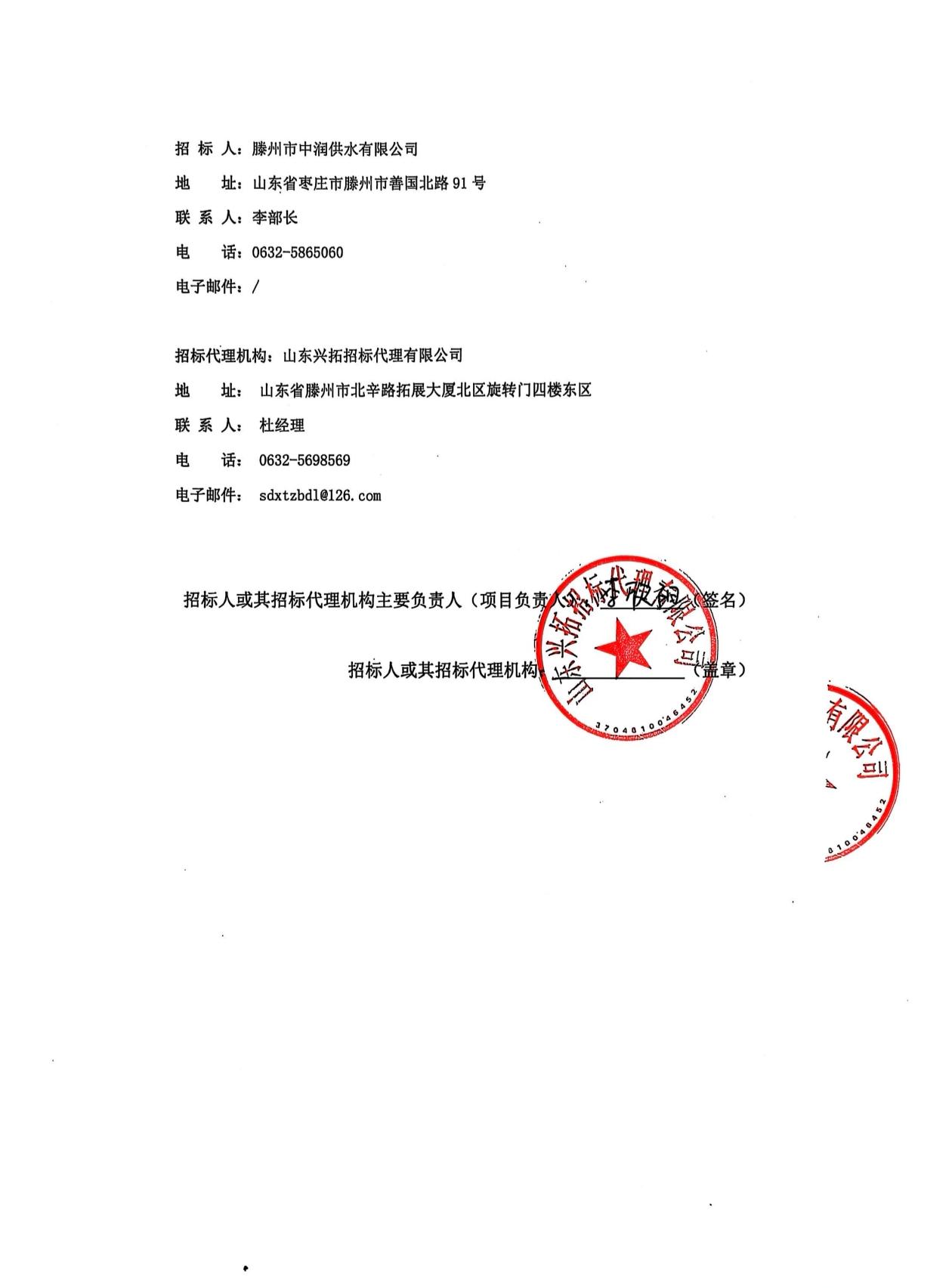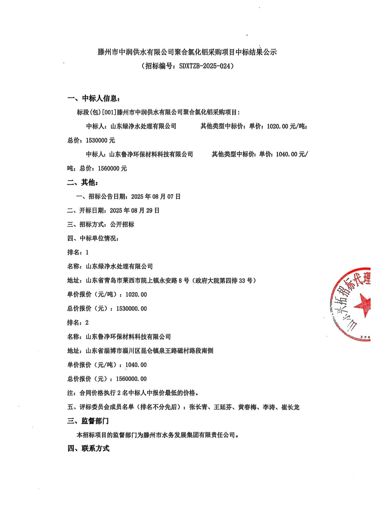 【中润公司】滕州市中润供水有限公司聚合氯化铝采购项目中标公告 日期:2025-09-01 点击: https://ctbpsp.com/#/bulletinDetail?uuid=631273e8-9677-4ad7-8c13-d8bb354b8de4&inpvalue=%E6%BB%95%E5%B7%9E%E5%B8%82%E4%B8%AD%E6%B6%A6%E4%BE%9B%E6%B0%B4%E6%9C%89%E9%99%90%E5%85%AC%E5%8F%B8&dataSource=0&tenderAgency= 最新推荐 【中润公司】滕州市中润供水有限公司香舍里花园四期闸阀及双偏心法兰蝶阀、球墨铸铁管件、电磁水表采购项目三标段(二次)废标公告 2025-09-11 人气:7 【中润公司】滕州市城乡供水水质提升项目管线下穿枣木高速(S83)、321省道及东木路(10K+472、18K+614)涉路工程咨询服务采购项目谈判公告 2025-09-08 人气:8 【汇通公司】水泥钢边井盖、雨水箅采购项目(二次)竞争性磋商公告 2025-09-08 人气:4 【汇通公司】水泥钢边井盖、雨水箅采购项目流标公告 2025-09-08 人气:2 【水发公司】滕州市水务发展有限公司安全技术咨询服务项目竞争性磋商公告 2025-09-08 人气:10 【国润公司】滕州市南四湖湖水东调工程--采购标招标公告 2025-09-08 人气:5 【国润公司】滕州市南四湖湖水东调工程--监理标,检测标,施工标,其他标招标公告 2025-09-08 人气:5 【中润公司】滕州市城乡供水一体化安全巩固提升工程(一期)监理标、质量检测标、设计施工总承包(EPC)招标公告 2025-09-05 人气:11 【中润公司】滕州市中润供水有限公司第一净水厂厂区标准化提升改造物料制作安装工程采购项目询价公告 2025-09-05 人气:5 【中润公司】滕州市中润供水有限公司西办公楼配电改造工程采购项目询价公告 2025-09-05 人气:3