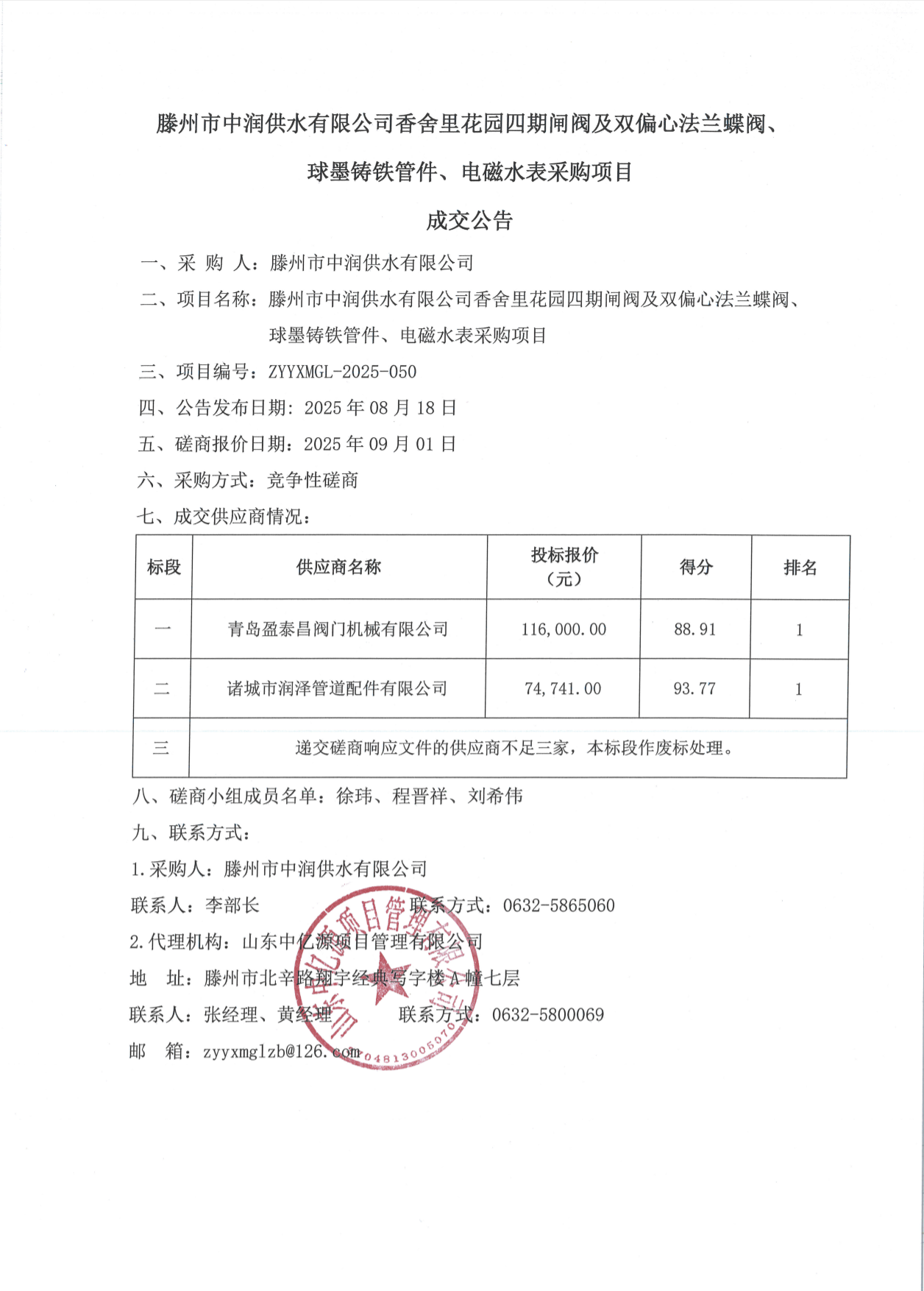 【中润公司】滕州市中润供水有限公司香舍里花园四期闸阀及双偏心法兰蝶阀、球墨铸铁管件、电磁水表采购项目中标公告 日期:2025-09-03 点击: 最新推荐 【中润公司】滕州市中润供水有限公司香舍里花园四期闸阀及双偏心法兰蝶阀、球墨铸铁管件、电磁水表采购项目三标段(二次)废标公告 2025-09-11 人气:7 【中润公司】滕州市城乡供水水质提升项目管线下穿枣木高速(S83)、321省道及东木路(10K+472、18K+614)涉路工程咨询服务采购项目谈判公告 2025-09-08 人气:8 【汇通公司】水泥钢边井盖、雨水箅采购项目(二次)竞争性磋商公告 2025-09-08 人气:4 【汇通公司】水泥钢边井盖、雨水箅采购项目流标公告 2025-09-08 人气:2 【水发公司】滕州市水务发展有限公司安全技术咨询服务项目竞争性磋商公告 2025-09-08 人气:10 【国润公司】滕州市南四湖湖水东调工程--采购标招标公告 2025-09-08 人气:5 【国润公司】滕州市南四湖湖水东调工程--监理标,检测标,施工标,其他标招标公告 2025-09-08 人气:5 【中润公司】滕州市城乡供水一体化安全巩固提升工程(一期)监理标、质量检测标、设计施工总承包(EPC)招标公告 2025-09-05 人气:11 【中润公司】滕州市中润供水有限公司第一净水厂厂区标准化提升改造物料制作安装工程采购项目询价公告 2025-09-05 人气:5 【中润公司】滕州市中润供水有限公司西办公楼配电改造工程采购项目询价公告 2025-09-05 人气:3