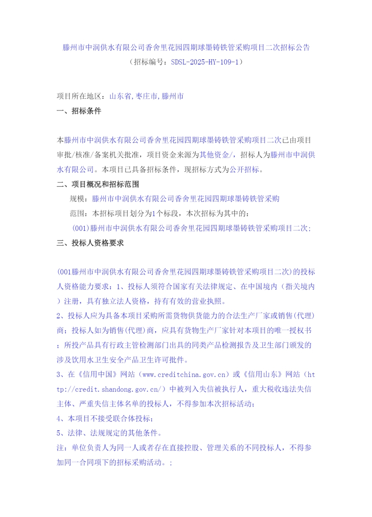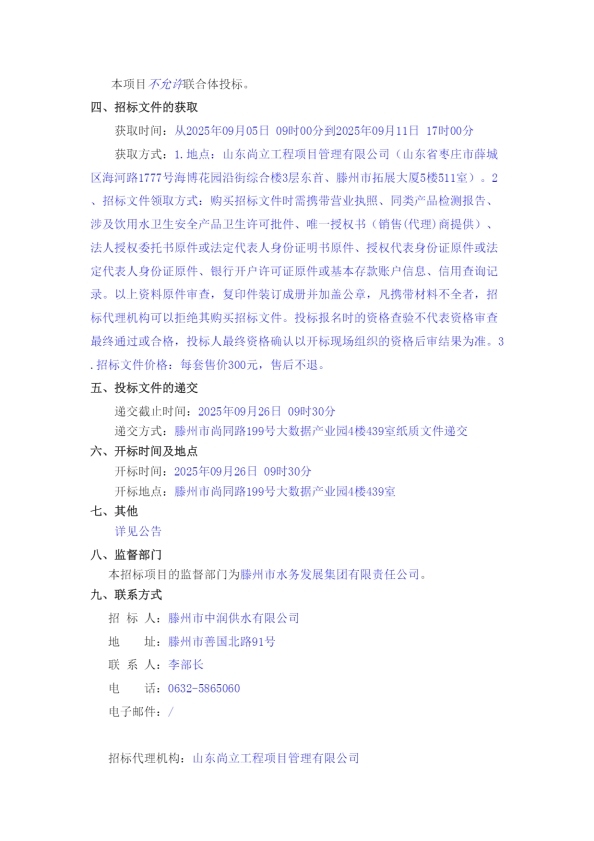 【中润公司】滕州市中润供水有限公司香舍里花园四期球墨铸铁管采购项目二次招标公告 日期:2025-09-05 点击: https://ctbpsp.com/#/bulletinDetail?uuid=8f897e72-cf84-4e86-994d-4bd9bc2dc5d3&inpvalue=%E6%BB%95%E5%B7%9E%E5%B8%82%E4%B8%AD%E6%B6%A6%E4%BE%9B%E6%B0%B4%E6%9C%89%E9%99%90%E5%85%AC%E5%8F%B8%E9%A6%99%E8%88%8D%E9%87%8C%E8%8A%B1%E5%9B%AD%E5%9B%9B%E6%9C%9F&dataSource=0&tenderAgency= 最新推荐 【中润公司】滕州市中润供水有限公司香舍里花园四期闸阀及双偏心法兰蝶阀、球墨铸铁管件、电磁水表采购项目三标段(二次)废标公告 2025-09-11 人气:7 【中润公司】滕州市城乡供水水质提升项目管线下穿枣木高速(S83)、321省道及东木路(10K+472、18K+614)涉路工程咨询服务采购项目谈判公告 2025-09-08 人气:8 【汇通公司】水泥钢边井盖、雨水箅采购项目(二次)竞争性磋商公告 2025-09-08 人气:4 【汇通公司】水泥钢边井盖、雨水箅采购项目流标公告 2025-09-08 人气:2 【水发公司】滕州市水务发展有限公司安全技术咨询服务项目竞争性磋商公告 2025-09-08 人气:10 【国润公司】滕州市南四湖湖水东调工程--采购标招标公告 2025-09-08 人气:5 【国润公司】滕州市南四湖湖水东调工程--监理标,检测标,施工标,其他标招标公告 2025-09-08 人气:5 【中润公司】滕州市城乡供水一体化安全巩固提升工程(一期)监理标、质量检测标、设计施工总承包(EPC)招标公告 2025-09-05 人气:11 【中润公司】滕州市中润供水有限公司第一净水厂厂区标准化提升改造物料制作安装工程采购项目询价公告 2025-09-05 人气:5 【中润公司】滕州市中润供水有限公司西办公楼配电改造工程采购项目询价公告 2025-09-05 人气:3