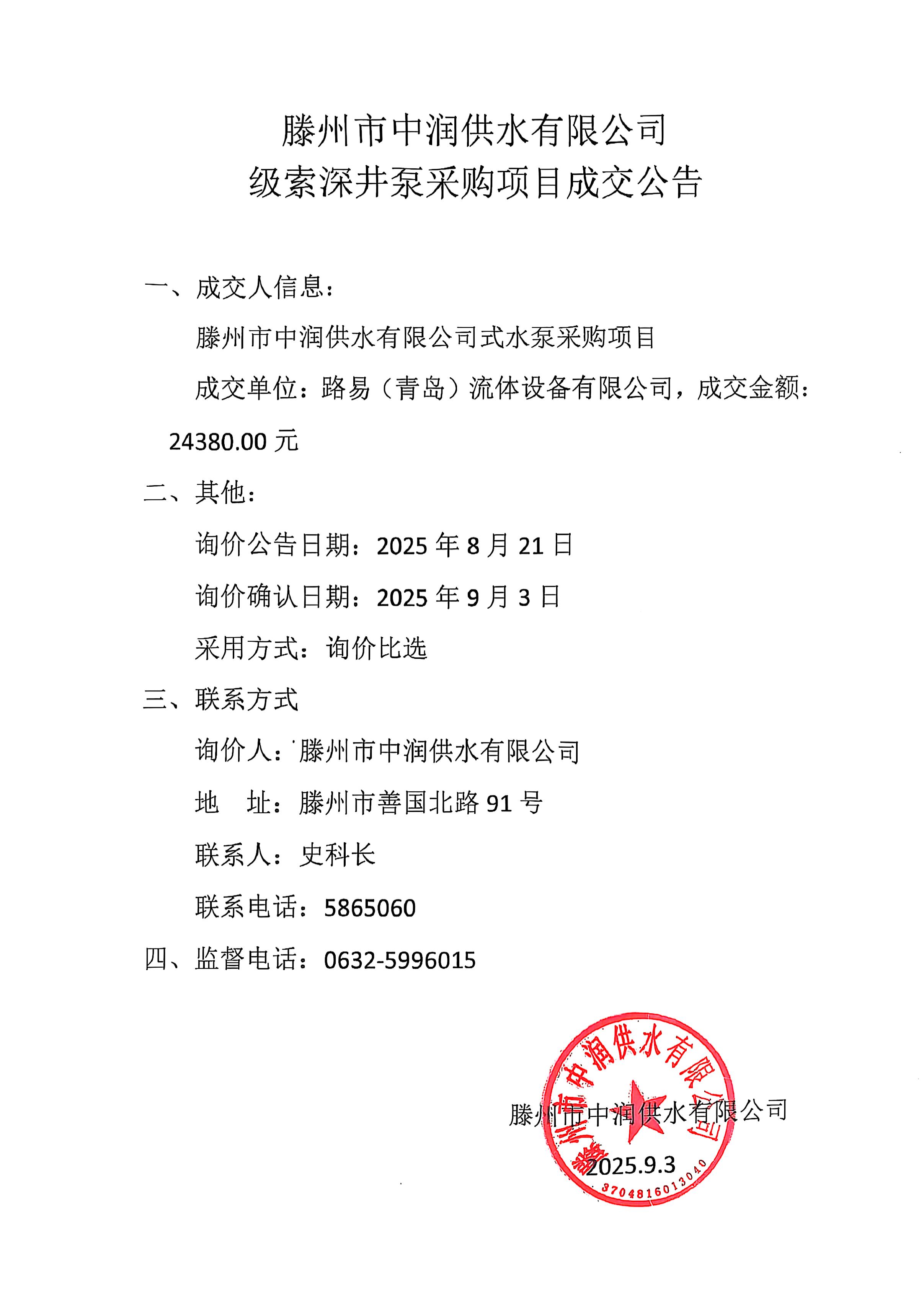 【中润公司】滕州市中润供水有限公司级索水厂深井泵采购项目成交公告 日期:2025-09-05 点击: 最新推荐 【中润公司】滕州市中润供水有限公司香舍里花园四期闸阀及双偏心法兰蝶阀、球墨铸铁管件、电磁水表采购项目三标段(二次)废标公告 2025-09-11 人气:7 【中润公司】滕州市城乡供水水质提升项目管线下穿枣木高速(S83)、321省道及东木路(10K+472、18K+614)涉路工程咨询服务采购项目谈判公告 2025-09-08 人气:8 【汇通公司】水泥钢边井盖、雨水箅采购项目(二次)竞争性磋商公告 2025-09-08 人气:4 【汇通公司】水泥钢边井盖、雨水箅采购项目流标公告 2025-09-08 人气:2 【水发公司】滕州市水务发展有限公司安全技术咨询服务项目竞争性磋商公告 2025-09-08 人气:10 【国润公司】滕州市南四湖湖水东调工程--采购标招标公告 2025-09-08 人气:5 【国润公司】滕州市南四湖湖水东调工程--监理标,检测标,施工标,其他标招标公告 2025-09-08 人气:5 【中润公司】滕州市城乡供水一体化安全巩固提升工程(一期)监理标、质量检测标、设计施工总承包(EPC)招标公告 2025-09-05 人气:11 【中润公司】滕州市中润供水有限公司第一净水厂厂区标准化提升改造物料制作安装工程采购项目询价公告 2025-09-05 人气:5 【中润公司】滕州市中润供水有限公司西办公楼配电改造工程采购项目询价公告 2025-09-05 人气:3