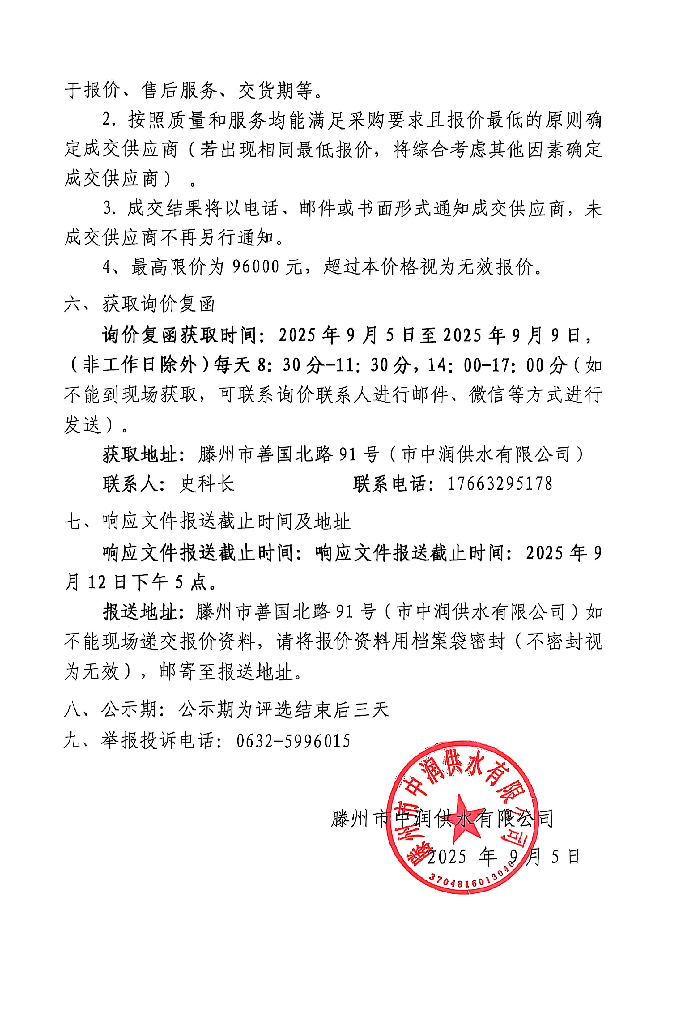 【中润公司】滕州市中润供水有限公司西办公楼配电改造工程采购项目询价公告 日期:2025-09-05 点击: 最新推荐 【中润公司】滕州市中润供水有限公司香舍里花园四期闸阀及双偏心法兰蝶阀、球墨铸铁管件、电磁水表采购项目三标段(二次)废标公告 2025-09-11 人气:7 【中润公司】滕州市城乡供水水质提升项目管线下穿枣木高速(S83)、321省道及东木路(10K+472、18K+614)涉路工程咨询服务采购项目谈判公告 2025-09-08 人气:8 【汇通公司】水泥钢边井盖、雨水箅采购项目(二次)竞争性磋商公告 2025-09-08 人气:4 【汇通公司】水泥钢边井盖、雨水箅采购项目流标公告 2025-09-08 人气:2 【水发公司】滕州市水务发展有限公司安全技术咨询服务项目竞争性磋商公告 2025-09-08 人气:10 【国润公司】滕州市南四湖湖水东调工程--采购标招标公告 2025-09-08 人气:5 【国润公司】滕州市南四湖湖水东调工程--监理标,检测标,施工标,其他标招标公告 2025-09-08 人气:5 【中润公司】滕州市城乡供水一体化安全巩固提升工程(一期)监理标、质量检测标、设计施工总承包(EPC)招标公告 2025-09-05 人气:11 【中润公司】滕州市中润供水有限公司第一净水厂厂区标准化提升改造物料制作安装工程采购项目询价公告 2025-09-05 人气:5 【中润公司】滕州市中润供水有限公司西办公楼配电改造工程采购项目询价公告 2025-09-05 人气:3