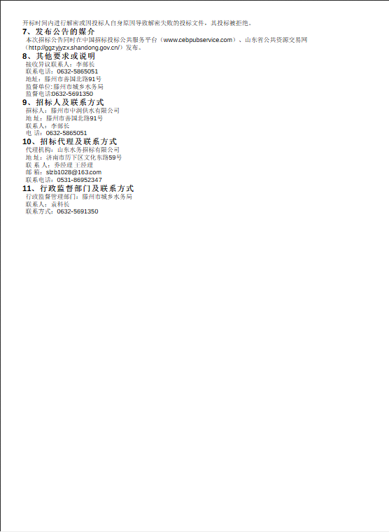 【中润公司】滕州市城乡供水一体化安全巩固提升工程(一期)监理标、质量检测标、设计施工总承包(EPC)招标公告 日期:2025-09-05 点击: https://ctbpsp.com/#/bulletinDetail?uuid=fde03bbd-1d66-4ff6-b692-277ff57b7da0&inpvalue=%E6%BB%95%E5%B7%9E%E5%B8%82%E5%9F%8E%E4%B9%A1%E4%BE%9B%E6%B0%B4%E4%B8%80%E4%BD%93%E5%8C%96&dataSource=1&tenderAgency= 最新推荐 【中润公司】滕州市中润供水有限公司香舍里花园四期闸阀及双偏心法兰蝶阀、球墨铸铁管件、电磁水表采购项目三标段(二次)废标公告 2025-09-11 人气:7 【中润公司】滕州市城乡供水水质提升项目管线下穿枣木高速(S83)、321省道及东木路(10K+472、18K+614)涉路工程咨询服务采购项目谈判公告 2025-09-08 人气:8 【汇通公司】水泥钢边井盖、雨水箅采购项目(二次)竞争性磋商公告 2025-09-08 人气:4 【汇通公司】水泥钢边井盖、雨水箅采购项目流标公告 2025-09-08 人气:2 【水发公司】滕州市水务发展有限公司安全技术咨询服务项目竞争性磋商公告 2025-09-08 人气:10 【国润公司】滕州市南四湖湖水东调工程--采购标招标公告 2025-09-08 人气:5 【国润公司】滕州市南四湖湖水东调工程--监理标,检测标,施工标,其他标招标公告 2025-09-08 人气:5 【中润公司】滕州市城乡供水一体化安全巩固提升工程(一期)监理标、质量检测标、设计施工总承包(EPC)招标公告 2025-09-05 人气:11 【中润公司】滕州市中润供水有限公司第一净水厂厂区标准化提升改造物料制作安装工程采购项目询价公告 2025-09-05 人气:5 【中润公司】滕州市中润供水有限公司西办公楼配电改造工程采购项目询价公告 2025-09-05 人气:3