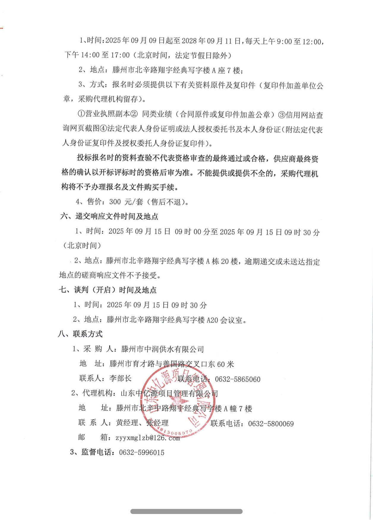 【中润公司】滕州市城乡供水水质提升项目管线下穿枣木高速(S83)、321省道及东木路(10K+472、18K+614)涉路工程咨询服务采购项目谈判公告 日期:2025-09-08 点击: https://ctbpsp.com/#/bulletinDetail?uuid=2bf253f8-fdf7-43dd-82a0-0f6cb2801de8&inpvalue=%E6%BB%95%E5%B7%9E%E5%B8%82%E5%9F%8E%E4%B9%A1%E4%BE%9B%E6%B0%B4%E6%B0%B4%E8%B4%A8%E6%8F%90%E5%8D%87%E9%A1%B9%E7%9B%AE&dataSource=0&tenderAgency= 最新推荐 【中润公司】滕州市中润供水有限公司香舍里花园四期闸阀及双偏心法兰蝶阀、球墨铸铁管件、电磁水表采购项目三标段(二次)废标公告 2025-09-11 人气:7 【中润公司】滕州市城乡供水水质提升项目管线下穿枣木高速(S83)、321省道及东木路(10K+472、18K+614)涉路工程咨询服务采购项目谈判公告 2025-09-08 人气:8 【汇通公司】水泥钢边井盖、雨水箅采购项目(二次)竞争性磋商公告 2025-09-08 人气:4 【汇通公司】水泥钢边井盖、雨水箅采购项目流标公告 2025-09-08 人气:2 【水发公司】滕州市水务发展有限公司安全技术咨询服务项目竞争性磋商公告 2025-09-08 人气:10 【国润公司】滕州市南四湖湖水东调工程--采购标招标公告 2025-09-08 人气:5 【国润公司】滕州市南四湖湖水东调工程--监理标,检测标,施工标,其他标招标公告 2025-09-08 人气:5 【中润公司】滕州市城乡供水一体化安全巩固提升工程(一期)监理标、质量检测标、设计施工总承包(EPC)招标公告 2025-09-05 人气:11 【中润公司】滕州市中润供水有限公司第一净水厂厂区标准化提升改造物料制作安装工程采购项目询价公告 2025-09-05 人气:5 【中润公司】滕州市中润供水有限公司西办公楼配电改造工程采购项目询价公告 2025-09-05 人气:3