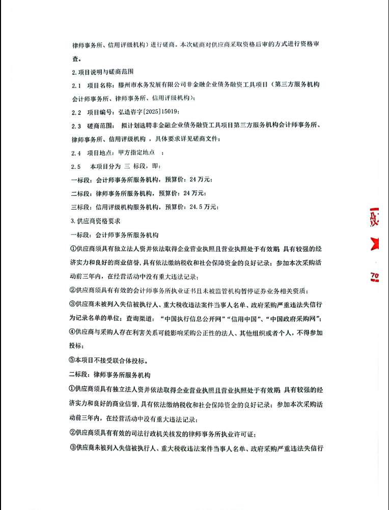 【水发公司】滕州市水务发展有限公司非金融企业债务融资工具项目(第三方服务机构会计师事务所、律师事务所、信用评级机构)竞争性磋商公告 日期:2025-09-24 点击: https://ctbpsp.com/#/bulletinDetail?uuid=2132de9e-c730-4163-981d-720ae7c8f7a9&inpvalue=%E6%BB%95%E5%B7%9E%E5%B8%82%E6%B0%B4%E5%8A%A1%E5%8F%91%E5%B1%95%E6%9C%89%E9%99%90%E5%85%AC%E5%8F%B8%E9%9D%9E%E9%87%91%E8%9E%8D%E4%BC%81%E4%B8%9A%E5%80%BA%E5%8A%A1%E8%9E%8D%E8%B5%84%E5%B7%A5%E5%85%B7%E9%A1%B9%E7%9B%AE&dataSource=0&tenderAgency= 最新推荐 【中润公司】滕州市中润供水有限公司安防系统及设备维保服务采购项目竞争性磋商公告 2025-09-24 人气:0 【水发公司】滕州市水务发展有限公司非金融企业债务融资工具项目第三方服务机构承销机构 招标公告 2025-09-24 人气:1 【水发公司】滕州市水务发展有限公司非金融企业债务融资工具项目(第三方服务机构会计师事务所、律师事务所、信用评级机构)竞争性磋商公告 2025-09-24 人气:1 【中润公司】滕州市供水管网生命线安全工程(一期)监理和施工招标公告 2025-09-24 人气:9 【水发公司】滕州市水务发展有限公司信息网络安全设计方案及投资评估项目成交公告 2025-09-23 人气:3 【水发公司】滕州市墨子湖生态农业创新示范区项目可行性研究报告编制项目公开招标公告 2025-09-22 人气:4 【中润公司】滕州市中润供水有限公司荆泉水源地职工之家修缮工程采购项目询价公告 2025-09-19 人气:7 【水发公司】滕州市水务发展有限公司安全技术咨询服务项目成交公告 2025-09-18 人气:6 【汇通排水】防汛应急抢险队先进事迹专题片制作竞争性谈判公告 2025-09-17 人气:6 【汇通公司】滕州市汇通排水有限公司水泥钢边井盖、雨水箅采购项目二次流标公告 2025-09-16 人气:8