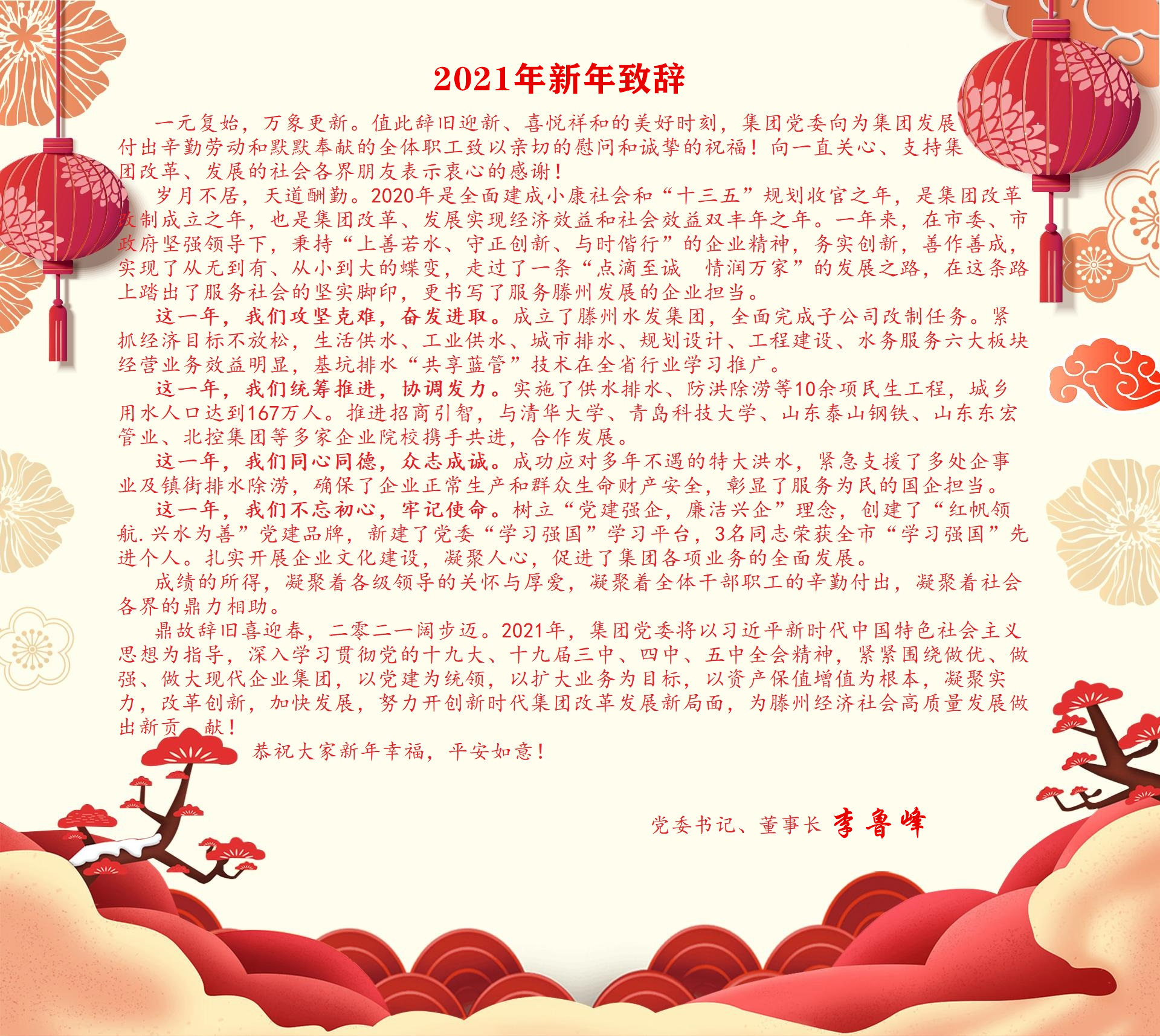 【集团动态】滕州水发集团2021年新年致辞 日期:2020-12-31 点击: 最新推荐 【集团动态】喜报!“善水进万家”志愿服务项目荣获2025年度枣庄市志愿服务项目大赛铜奖 2025-09-10 人气:11 【集团动态】精准巡检除隐患 多措并举保畅通 2025-09-09 人气:16 【集团动态】滕州市水务发展集团中润供水有限公司营销管理系统建设项目正式启动 2025-09-05 人气:37 【集团动态】开展水站提井检查 守护深层供水安全 2025-09-03 人气:20 【集团动态】高效优质建工程 锦旗致谢显担当 2025-08-29 人气:38 【集团动态】滕州市精密水表制造基地建设项目签约仪式圆满举行 2025-08-28 人气:46 【集团动态】管道机器人全面“上岗” 精准检测城市地下管网 2025-08-24 人气:29 【集团动态】滕州市水务发展集团中润供水有限公司开展离休干部大走访活动 2025-08-24 人气:30 【集团动态】滕州市水务发展集团中润供水有限公司开展文秘宣传岗职员竞选活动 2025-08-24 人气:27 【集团动态】锦旗映初心 实干暖民心 2025-08-22 人气:56