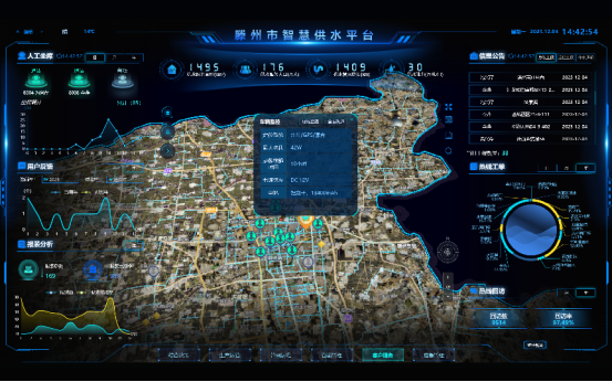 滕州市智慧供水平台基于中地数码MapGIS地理信息系统作为底层平台,并采用了先进的物联网技术、大数据分析、云计算技术、空间数据与BI数据可视化技术搭建,围绕综合决策、生产运行、管网运维、营销管理、客户服务、应急指挥等板块分析数据,实现数据可视化、动态展示、智能分析,构建了涵盖源水、制水、供水、用户等全业务流程的综合监管和供水一张图管理。为公司的综合决策、应急调度、智能分析等提供数据支撑。