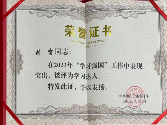 12月28日,“学习强国”枣庄学习平台上线启动仪式在枣庄市新闻传媒中心演播厅举行。在启动仪式上,市水务发展集团中辉建设工程有限公司刘雷同志荣获2023年枣庄市学习强国“学习达人”荣誉称号。