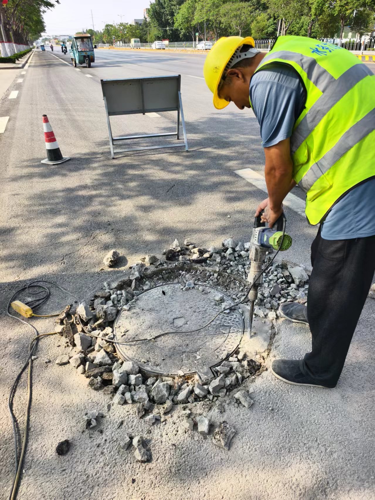 “一张网,网住的不仅仅是井盖,更是市民群众的安全感和幸福感”,在益康大道海吉雅环保门北路段,工作人员对破损检查井进行维修加固,更换新铸铁检查井盖安装防坠网后,再用沥青恢复路面,切实守护市民脚下安全。