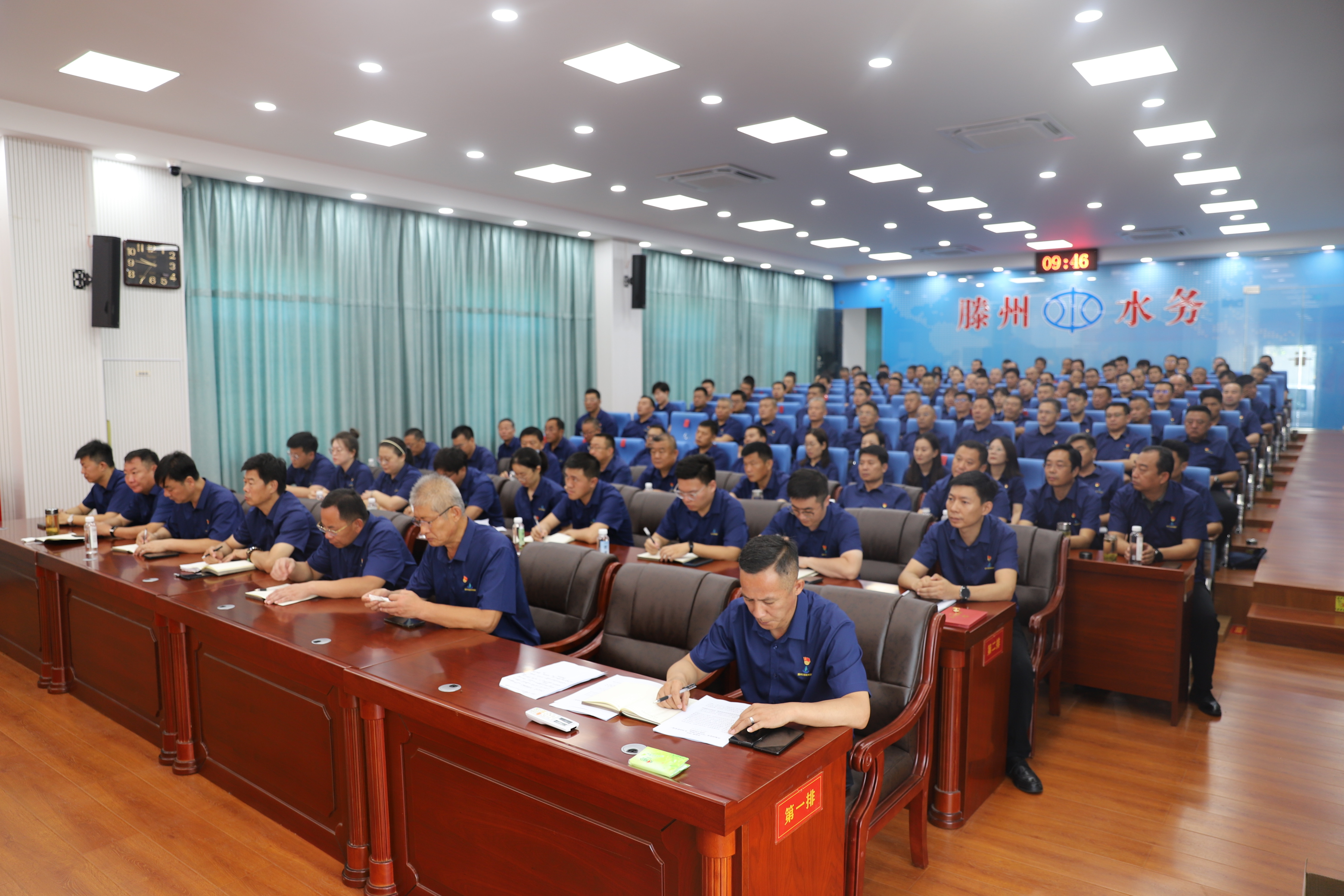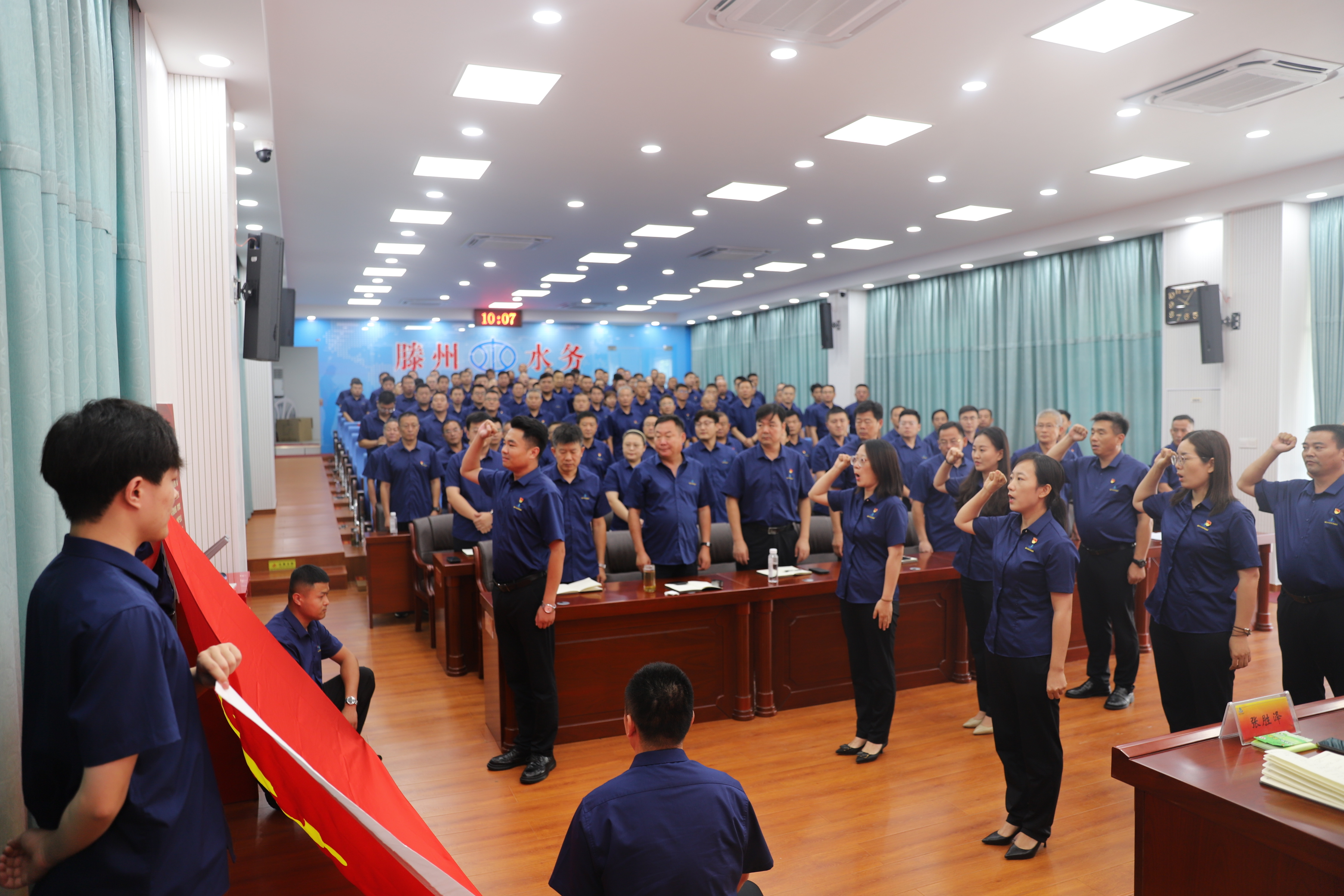 集团党委书记、董事长李亚峰,围绕“凝心聚力担使命、践行初心当先锋”主题作了重要讲话。李亚峰强调,党员干部要加倍珍惜荣誉,永葆标杆旗帜的先进本色,充分发挥基层党组织的战斗堡垒和党员先锋模范作用,持续深化“我是党员·我在岗”“有困难找我,干工作看我”系列活动,继续推行党员网格化和日常表现纪实管理,以党员的先进思想、模范行动和过硬作风影响周边、带动一片、护航集团改革高质量发展。要坚守初心使命,争当改革发展的时代先锋,时刻牢记第一身份是共产党员,不断提高自身的能力和本领,做到平时要看的出来,关键时刻站的出来、危机时刻豁的出去。要擦亮底色当先锋,在防汛排水、项目建设等急难险重的工作中,发扬好“传承、担当、奉献、坚守”的水发精神,挺身而出、冲锋在前,用实际行动彰显党员的初心誓言和国企的责任担当。要锤炼作风,营造干事创业的良好氛围,继续开展党员干部“明职责、强担当、知敬畏、存戒惧”承诺践诺公示活动,彻底整治群众身边的不正之风和微腐败问题,不断优化营商环境,持续深化“001+1”前置服务模式,全力推动供排水业务协同发展、一体服务,真正做到问需于企“面对面”,精准服务“实打实”,为滕州“强工兴产、项目突破”提供坚实的基础保障。