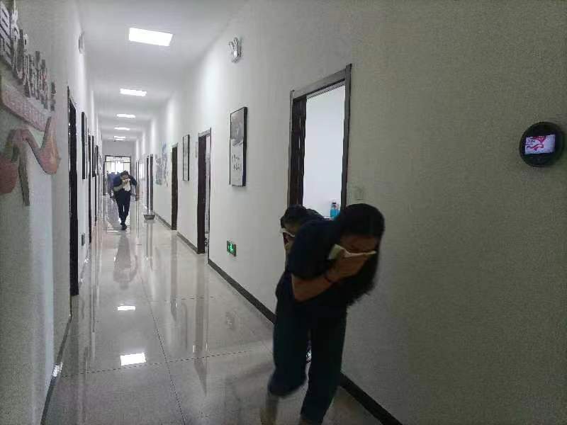 在应急逃生演练过程中,全体职工用湿毛巾捂住口鼻,弯腰低姿前行,按照预先规划的疏散路线高效有序地撤离到安全区域,整个演练过程达到了预期效果。