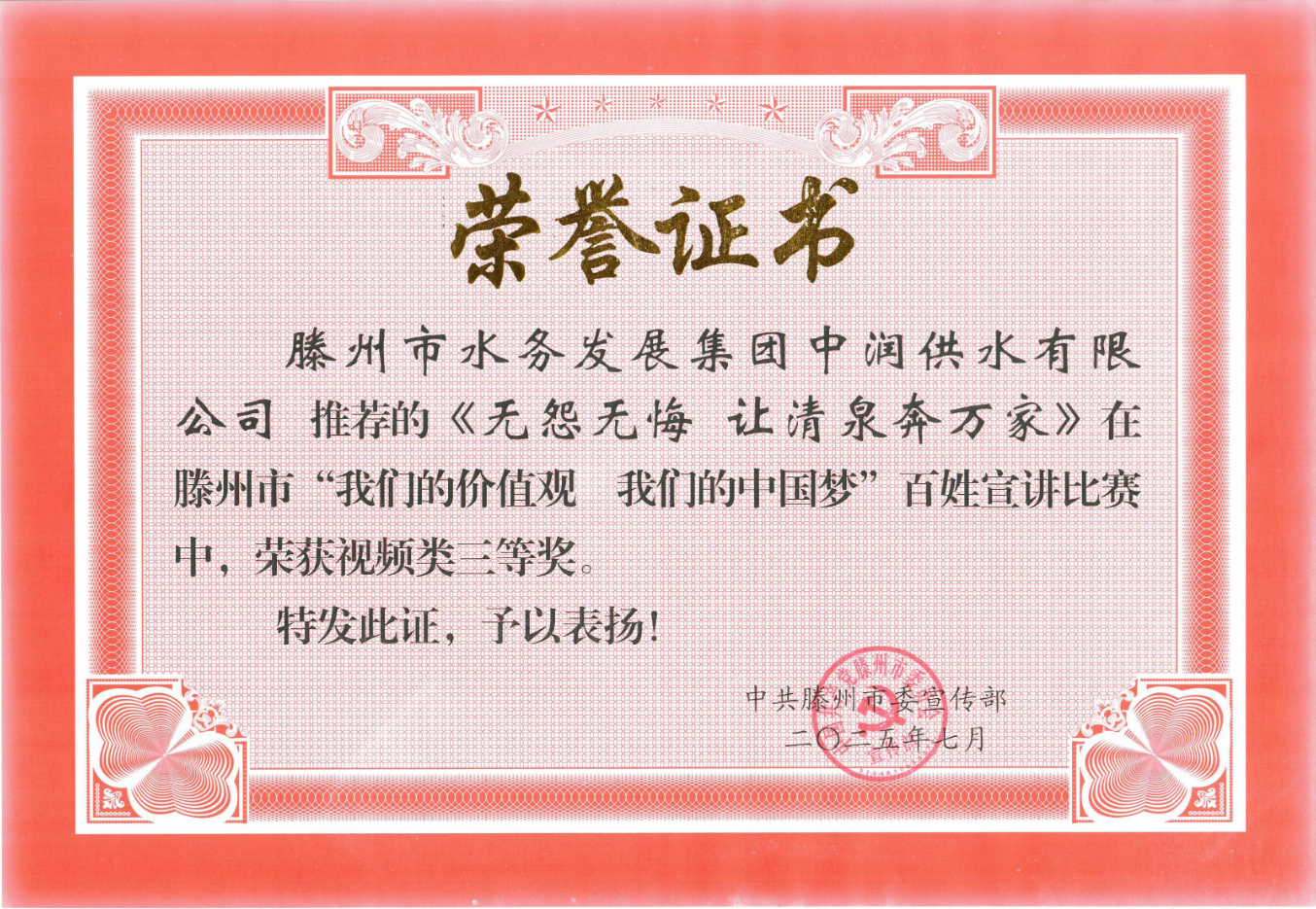 为深入学习贯彻习近平新时代中国特色社会主义思想,推动党的创新理论“飞入寻常百姓家”,7月17日,滕州市“我们的价值观 我们的中国梦”百姓宣讲比赛在市融媒体举行。滕州市水务发展集团中润供水有限公司推荐的《无怨无悔 让清泉奔万家》作品,荣获视频类三等奖。