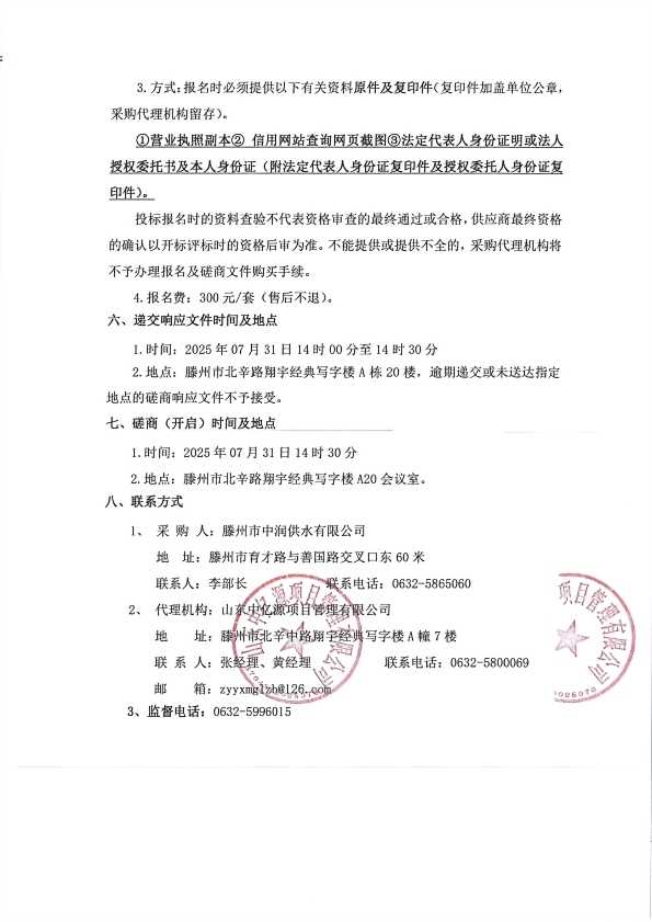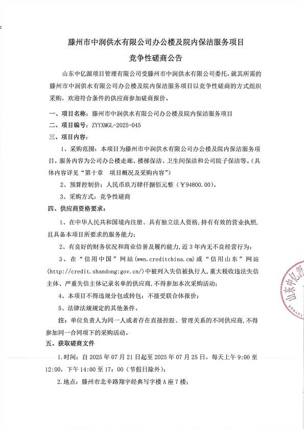 【中润公司】滕州市中润供水有限公司办公楼及院内保洁服务项目 日期:2025-07-21 点击: 最新推荐 【中润公司】滕州市中润供水有限公司香舍里花园四期闸阀及双偏心法兰蝶阀、球墨铸铁管件、电磁水表采购项目三标段(二次)废标公告 2025-09-11 人气:7 【中润公司】滕州市城乡供水水质提升项目管线下穿枣木高速(S83)、321省道及东木路(10K+472、18K+614)涉路工程咨询服务采购项目谈判公告 2025-09-08 人气:8 【汇通公司】水泥钢边井盖、雨水箅采购项目(二次)竞争性磋商公告 2025-09-08 人气:4 【汇通公司】水泥钢边井盖、雨水箅采购项目流标公告 2025-09-08 人气:2 【水发公司】滕州市水务发展有限公司安全技术咨询服务项目竞争性磋商公告 2025-09-08 人气:10 【国润公司】滕州市南四湖湖水东调工程--采购标招标公告 2025-09-08 人气:5 【国润公司】滕州市南四湖湖水东调工程--监理标,检测标,施工标,其他标招标公告 2025-09-08 人气:5 【中润公司】滕州市城乡供水一体化安全巩固提升工程(一期)监理标、质量检测标、设计施工总承包(EPC)招标公告 2025-09-05 人气:11 【中润公司】滕州市中润供水有限公司第一净水厂厂区标准化提升改造物料制作安装工程采购项目询价公告 2025-09-05 人气:5 【中润公司】滕州市中润供水有限公司西办公楼配电改造工程采购项目询价公告 2025-09-05 人气:3