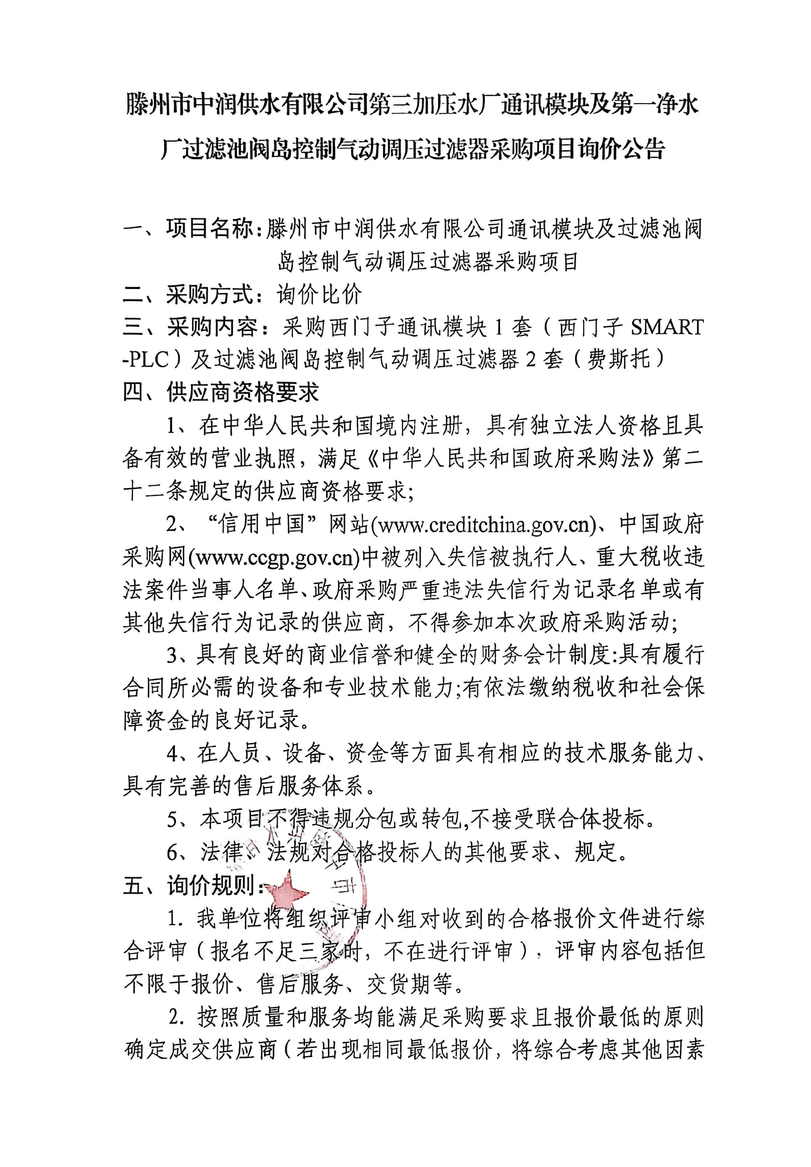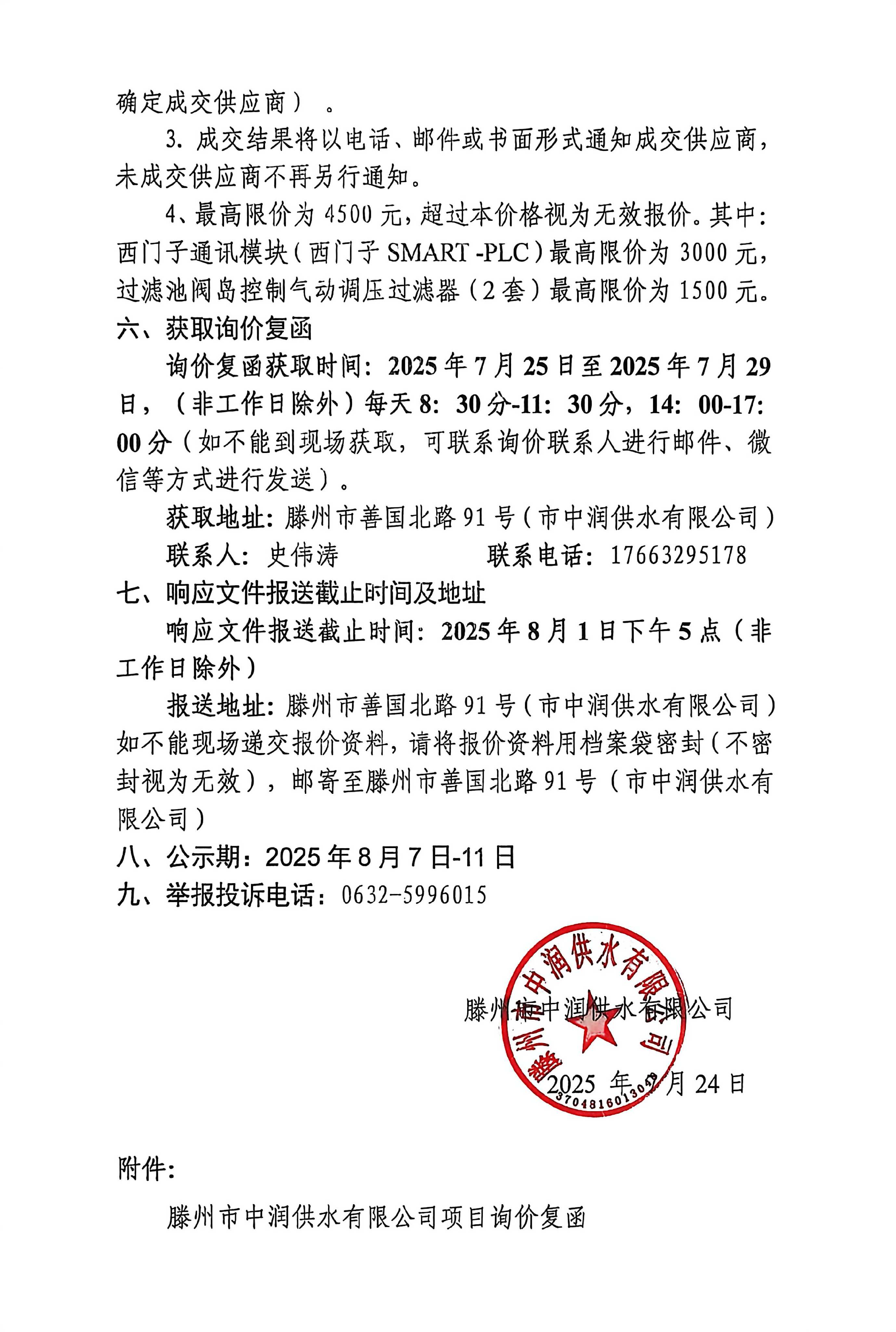 【中润公司】滕州市中润供水有限公司第三加压水厂通讯模块及第一净水厂过滤池阀岛控制气动调压过滤器采购项目 日期:2025-07-24 点击: 最新推荐 【中润公司】滕州市中润供水有限公司香舍里花园四期闸阀及双偏心法兰蝶阀、球墨铸铁管件、电磁水表采购项目三标段(二次)废标公告 2025-09-11 人气:7 【中润公司】滕州市城乡供水水质提升项目管线下穿枣木高速(S83)、321省道及东木路(10K+472、18K+614)涉路工程咨询服务采购项目谈判公告 2025-09-08 人气:8 【汇通公司】水泥钢边井盖、雨水箅采购项目(二次)竞争性磋商公告 2025-09-08 人气:4 【汇通公司】水泥钢边井盖、雨水箅采购项目流标公告 2025-09-08 人气:2 【水发公司】滕州市水务发展有限公司安全技术咨询服务项目竞争性磋商公告 2025-09-08 人气:10 【国润公司】滕州市南四湖湖水东调工程--采购标招标公告 2025-09-08 人气:5 【国润公司】滕州市南四湖湖水东调工程--监理标,检测标,施工标,其他标招标公告 2025-09-08 人气:5 【中润公司】滕州市城乡供水一体化安全巩固提升工程(一期)监理标、质量检测标、设计施工总承包(EPC)招标公告 2025-09-05 人气:11 【中润公司】滕州市中润供水有限公司第一净水厂厂区标准化提升改造物料制作安装工程采购项目询价公告 2025-09-05 人气:5 【中润公司】滕州市中润供水有限公司西办公楼配电改造工程采购项目询价公告 2025-09-05 人气:3