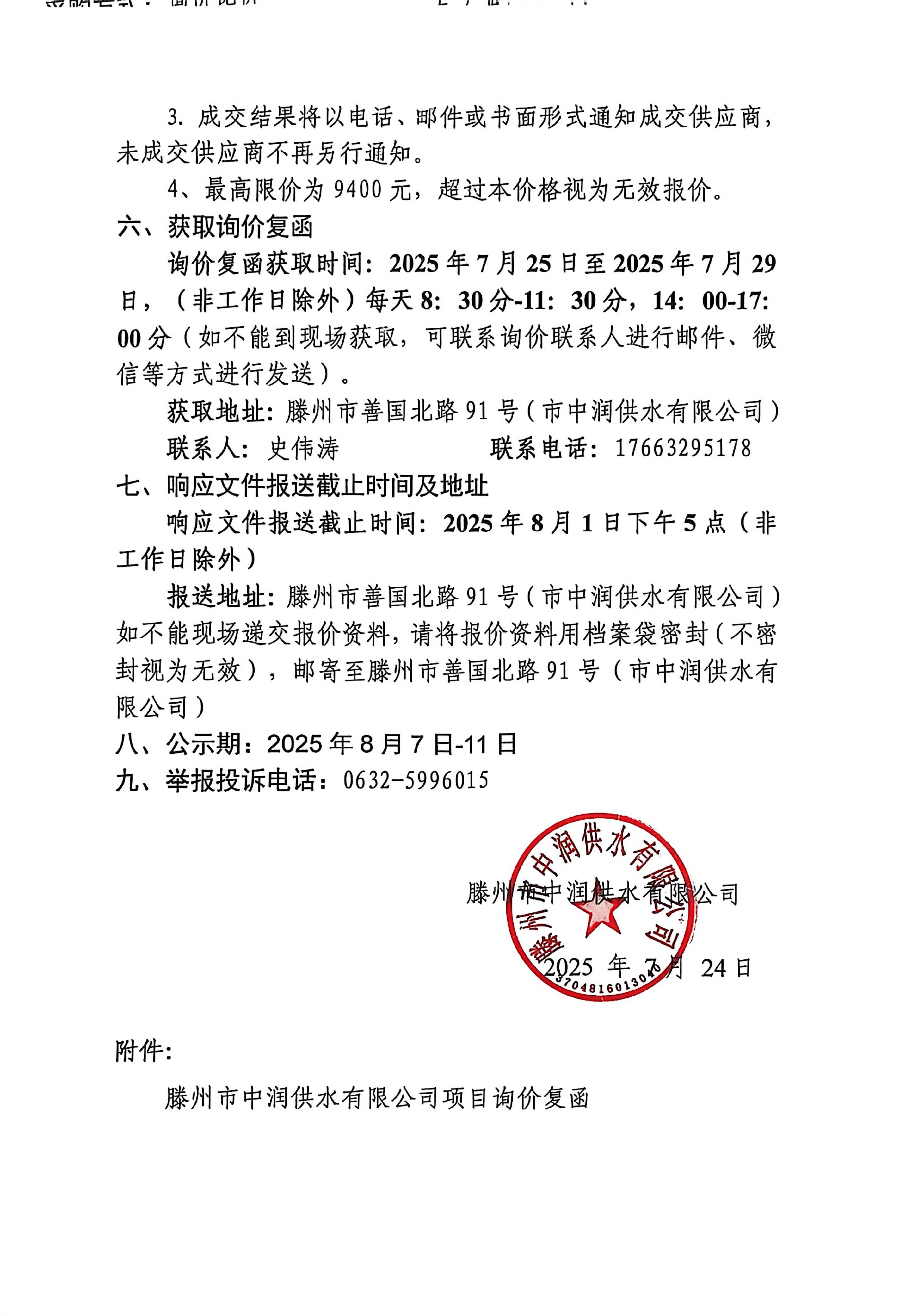 【中润公司】滕州市中润供水有限公司聚丙烯酰胺阳离子采购项目 日期:2025-07-24 点击: 最新推荐 【中润公司】滕州市中润供水有限公司香舍里花园四期闸阀及双偏心法兰蝶阀、球墨铸铁管件、电磁水表采购项目三标段(二次)废标公告 2025-09-11 人气:7 【中润公司】滕州市城乡供水水质提升项目管线下穿枣木高速(S83)、321省道及东木路(10K+472、18K+614)涉路工程咨询服务采购项目谈判公告 2025-09-08 人气:8 【汇通公司】水泥钢边井盖、雨水箅采购项目(二次)竞争性磋商公告 2025-09-08 人气:4 【汇通公司】水泥钢边井盖、雨水箅采购项目流标公告 2025-09-08 人气:2 【水发公司】滕州市水务发展有限公司安全技术咨询服务项目竞争性磋商公告 2025-09-08 人气:10 【国润公司】滕州市南四湖湖水东调工程--采购标招标公告 2025-09-08 人气:5 【国润公司】滕州市南四湖湖水东调工程--监理标,检测标,施工标,其他标招标公告 2025-09-08 人气:5 【中润公司】滕州市城乡供水一体化安全巩固提升工程(一期)监理标、质量检测标、设计施工总承包(EPC)招标公告 2025-09-05 人气:11 【中润公司】滕州市中润供水有限公司第一净水厂厂区标准化提升改造物料制作安装工程采购项目询价公告 2025-09-05 人气:5 【中润公司】滕州市中润供水有限公司西办公楼配电改造工程采购项目询价公告 2025-09-05 人气:3