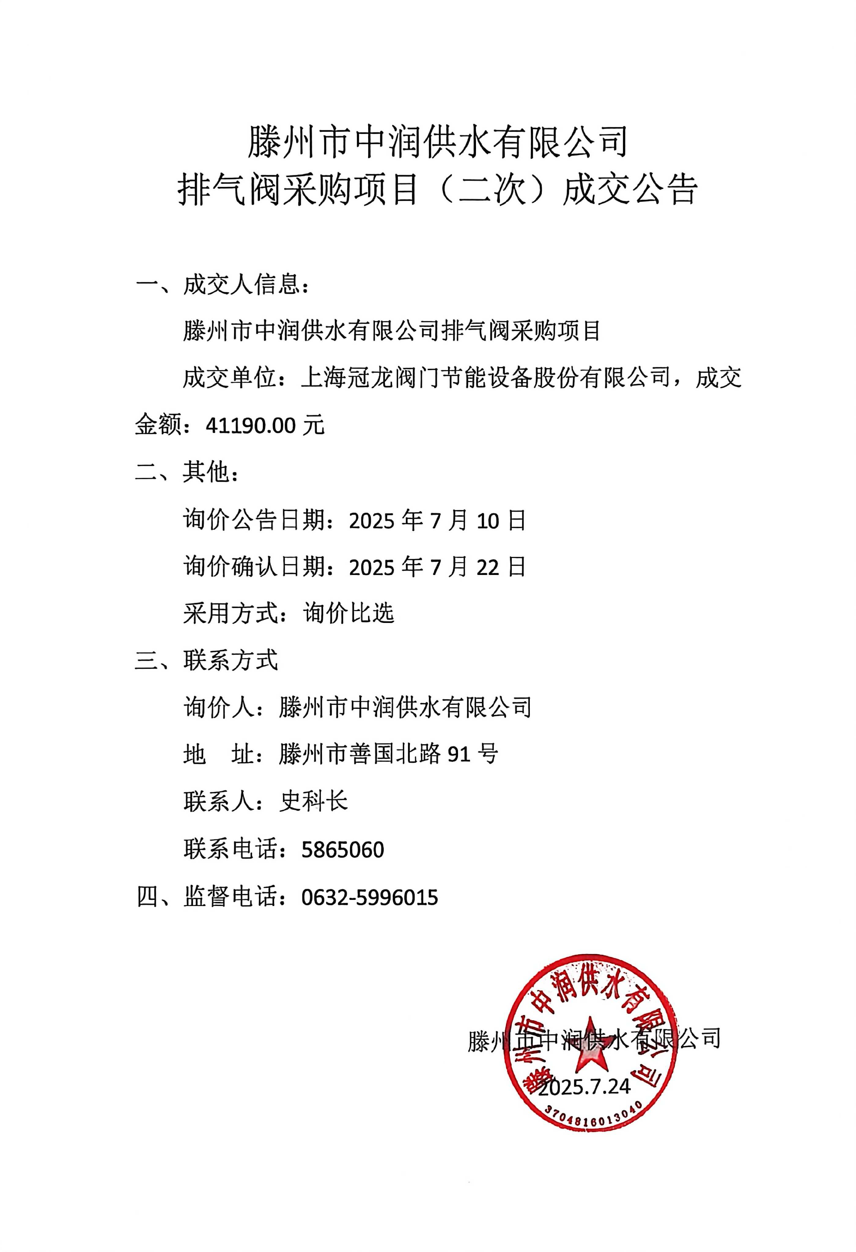 【中润公司】滕州市中润供水公司排气阀采购项目(二次)成交公告 日期:2025-07-25 点击: 最新推荐 【中润公司】滕州市中润供水有限公司香舍里花园四期闸阀及双偏心法兰蝶阀、球墨铸铁管件、电磁水表采购项目三标段(二次)废标公告 2025-09-11 人气:7 【中润公司】滕州市城乡供水水质提升项目管线下穿枣木高速(S83)、321省道及东木路(10K+472、18K+614)涉路工程咨询服务采购项目谈判公告 2025-09-08 人气:8 【汇通公司】水泥钢边井盖、雨水箅采购项目(二次)竞争性磋商公告 2025-09-08 人气:4 【汇通公司】水泥钢边井盖、雨水箅采购项目流标公告 2025-09-08 人气:2 【水发公司】滕州市水务发展有限公司安全技术咨询服务项目竞争性磋商公告 2025-09-08 人气:10 【国润公司】滕州市南四湖湖水东调工程--采购标招标公告 2025-09-08 人气:5 【国润公司】滕州市南四湖湖水东调工程--监理标,检测标,施工标,其他标招标公告 2025-09-08 人气:5 【中润公司】滕州市城乡供水一体化安全巩固提升工程(一期)监理标、质量检测标、设计施工总承包(EPC)招标公告 2025-09-05 人气:11 【中润公司】滕州市中润供水有限公司第一净水厂厂区标准化提升改造物料制作安装工程采购项目询价公告 2025-09-05 人气:5 【中润公司】滕州市中润供水有限公司西办公楼配电改造工程采购项目询价公告 2025-09-05 人气:3