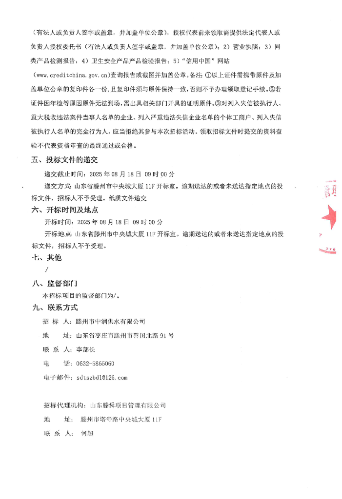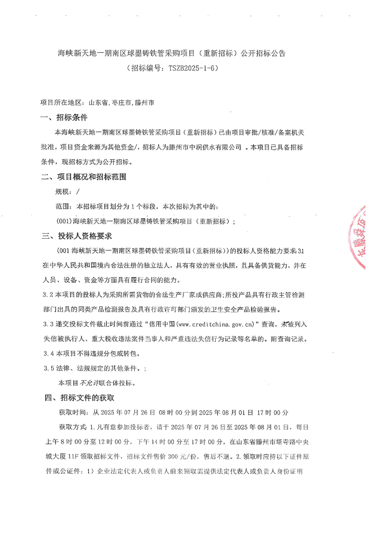 【中润公司】海峡新天地一期南区球墨铸铁管采购项目(三次)招标公告 日期:2025-07-25 点击: 最新推荐 【中润公司】滕州市中润供水有限公司香舍里花园四期闸阀及双偏心法兰蝶阀、球墨铸铁管件、电磁水表采购项目三标段(二次)废标公告 2025-09-11 人气:7 【中润公司】滕州市城乡供水水质提升项目管线下穿枣木高速(S83)、321省道及东木路(10K+472、18K+614)涉路工程咨询服务采购项目谈判公告 2025-09-08 人气:8 【汇通公司】水泥钢边井盖、雨水箅采购项目(二次)竞争性磋商公告 2025-09-08 人气:4 【汇通公司】水泥钢边井盖、雨水箅采购项目流标公告 2025-09-08 人气:2 【水发公司】滕州市水务发展有限公司安全技术咨询服务项目竞争性磋商公告 2025-09-08 人气:10 【国润公司】滕州市南四湖湖水东调工程--采购标招标公告 2025-09-08 人气:5 【国润公司】滕州市南四湖湖水东调工程--监理标,检测标,施工标,其他标招标公告 2025-09-08 人气:5 【中润公司】滕州市城乡供水一体化安全巩固提升工程(一期)监理标、质量检测标、设计施工总承包(EPC)招标公告 2025-09-05 人气:11 【中润公司】滕州市中润供水有限公司第一净水厂厂区标准化提升改造物料制作安装工程采购项目询价公告 2025-09-05 人气:5 【中润公司】滕州市中润供水有限公司西办公楼配电改造工程采购项目询价公告 2025-09-05 人气:3