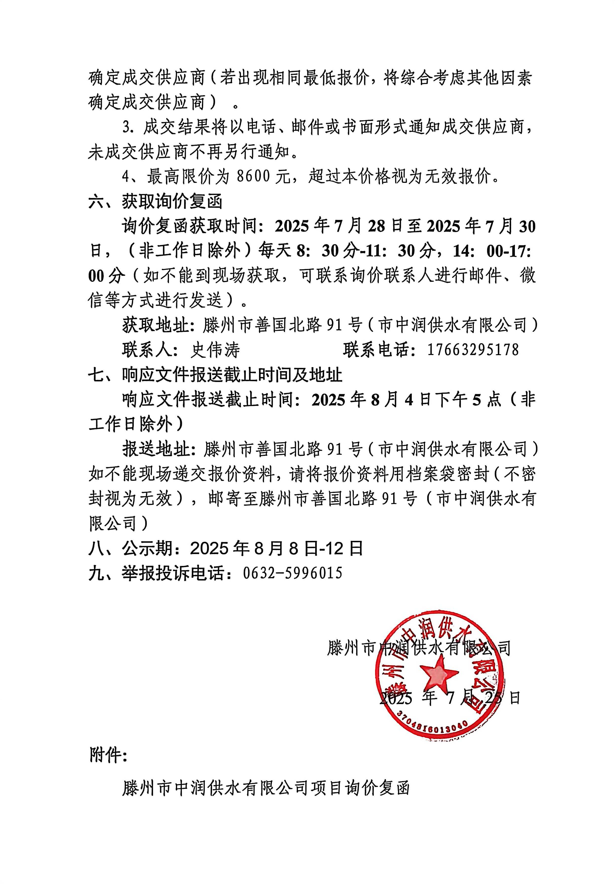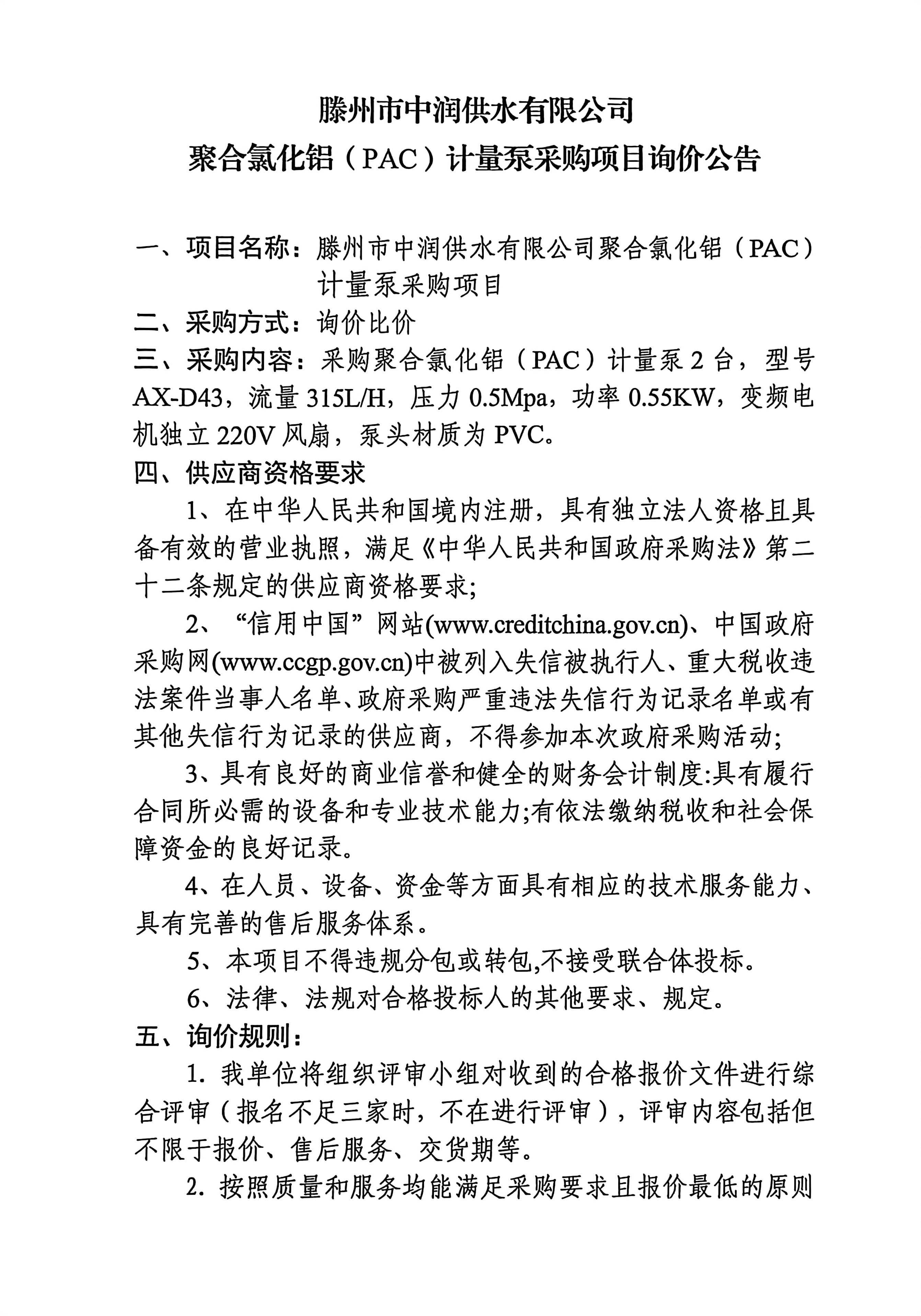 【中润公司】滕州市中润供水有限公司聚合氯化铝(PAC)计量泵采购项目询价公告 日期:2025-07-25 点击: 最新推荐 【中润公司】滕州市中润供水有限公司香舍里花园四期闸阀及双偏心法兰蝶阀、球墨铸铁管件、电磁水表采购项目三标段(二次)废标公告 2025-09-11 人气:7 【中润公司】滕州市城乡供水水质提升项目管线下穿枣木高速(S83)、321省道及东木路(10K+472、18K+614)涉路工程咨询服务采购项目谈判公告 2025-09-08 人气:8 【汇通公司】水泥钢边井盖、雨水箅采购项目(二次)竞争性磋商公告 2025-09-08 人气:4 【汇通公司】水泥钢边井盖、雨水箅采购项目流标公告 2025-09-08 人气:2 【水发公司】滕州市水务发展有限公司安全技术咨询服务项目竞争性磋商公告 2025-09-08 人气:10 【国润公司】滕州市南四湖湖水东调工程--采购标招标公告 2025-09-08 人气:5 【国润公司】滕州市南四湖湖水东调工程--监理标,检测标,施工标,其他标招标公告 2025-09-08 人气:5 【中润公司】滕州市城乡供水一体化安全巩固提升工程(一期)监理标、质量检测标、设计施工总承包(EPC)招标公告 2025-09-05 人气:11 【中润公司】滕州市中润供水有限公司第一净水厂厂区标准化提升改造物料制作安装工程采购项目询价公告 2025-09-05 人气:5 【中润公司】滕州市中润供水有限公司西办公楼配电改造工程采购项目询价公告 2025-09-05 人气:3