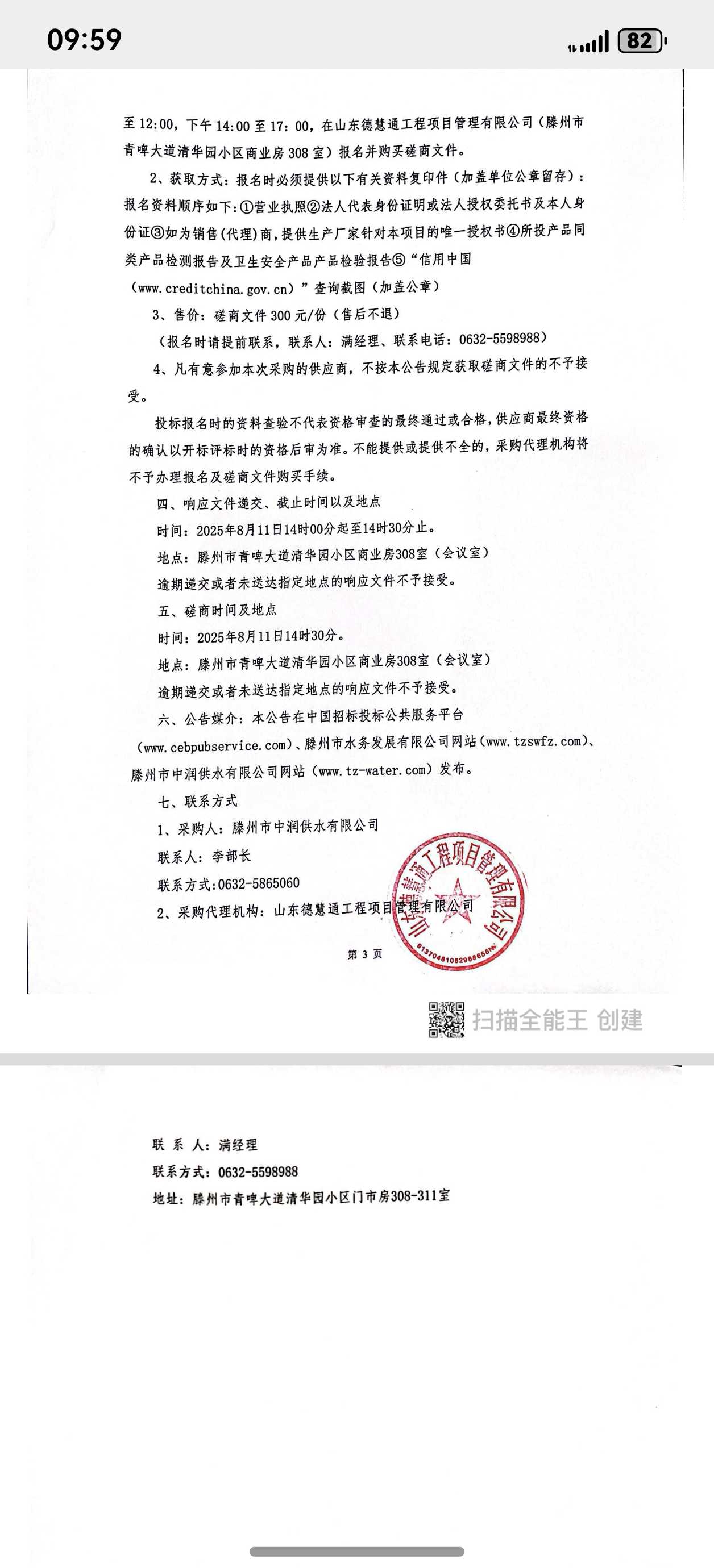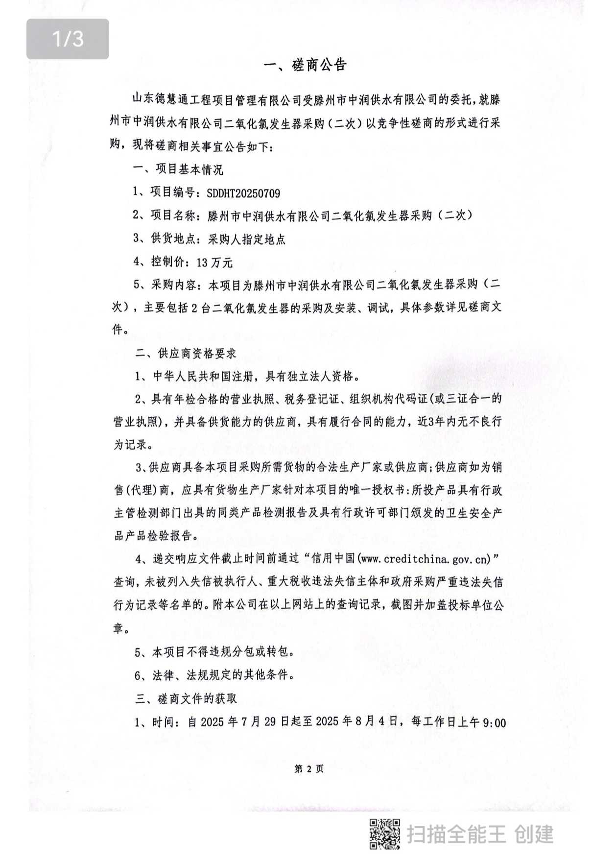 【中润公司】二氧化氯发生器采购(二次)招标公告 日期:2025-07-29 点击: 最新推荐 【中润公司】滕州市中润供水有限公司香舍里花园四期闸阀及双偏心法兰蝶阀、球墨铸铁管件、电磁水表采购项目三标段(二次)废标公告 2025-09-11 人气:7 【中润公司】滕州市城乡供水水质提升项目管线下穿枣木高速(S83)、321省道及东木路(10K+472、18K+614)涉路工程咨询服务采购项目谈判公告 2025-09-08 人气:8 【汇通公司】水泥钢边井盖、雨水箅采购项目(二次)竞争性磋商公告 2025-09-08 人气:4 【汇通公司】水泥钢边井盖、雨水箅采购项目流标公告 2025-09-08 人气:2 【水发公司】滕州市水务发展有限公司安全技术咨询服务项目竞争性磋商公告 2025-09-08 人气:10 【国润公司】滕州市南四湖湖水东调工程--采购标招标公告 2025-09-08 人气:5 【国润公司】滕州市南四湖湖水东调工程--监理标,检测标,施工标,其他标招标公告 2025-09-08 人气:5 【中润公司】滕州市城乡供水一体化安全巩固提升工程(一期)监理标、质量检测标、设计施工总承包(EPC)招标公告 2025-09-05 人气:11 【中润公司】滕州市中润供水有限公司第一净水厂厂区标准化提升改造物料制作安装工程采购项目询价公告 2025-09-05 人气:5 【中润公司】滕州市中润供水有限公司西办公楼配电改造工程采购项目询价公告 2025-09-05 人气:3